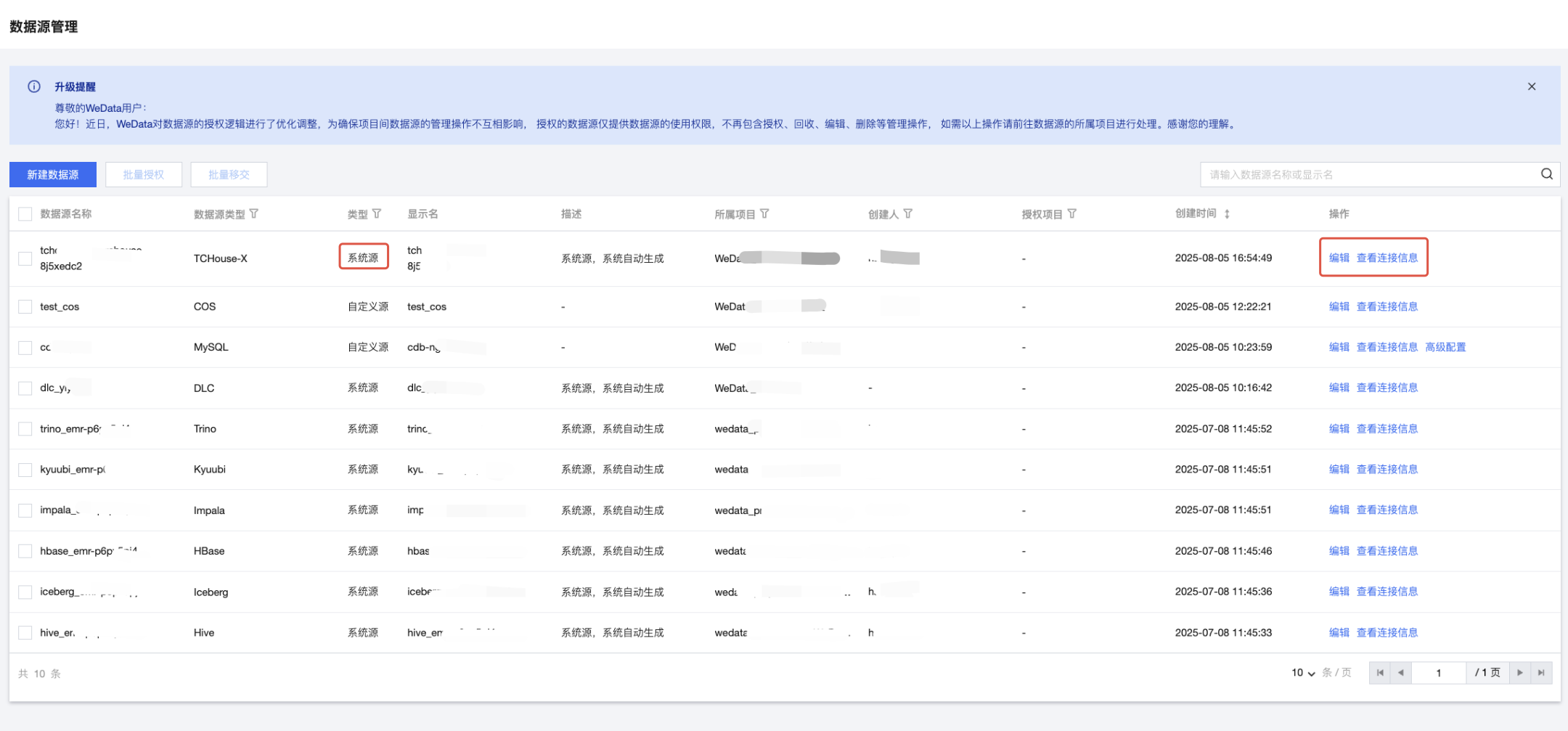 系统源为用户在项目中绑定计算引擎时自动创建的数据源。系统源目前仅支持用户查看数据源连接信息和编辑,不支持删除、授权与回收操作。