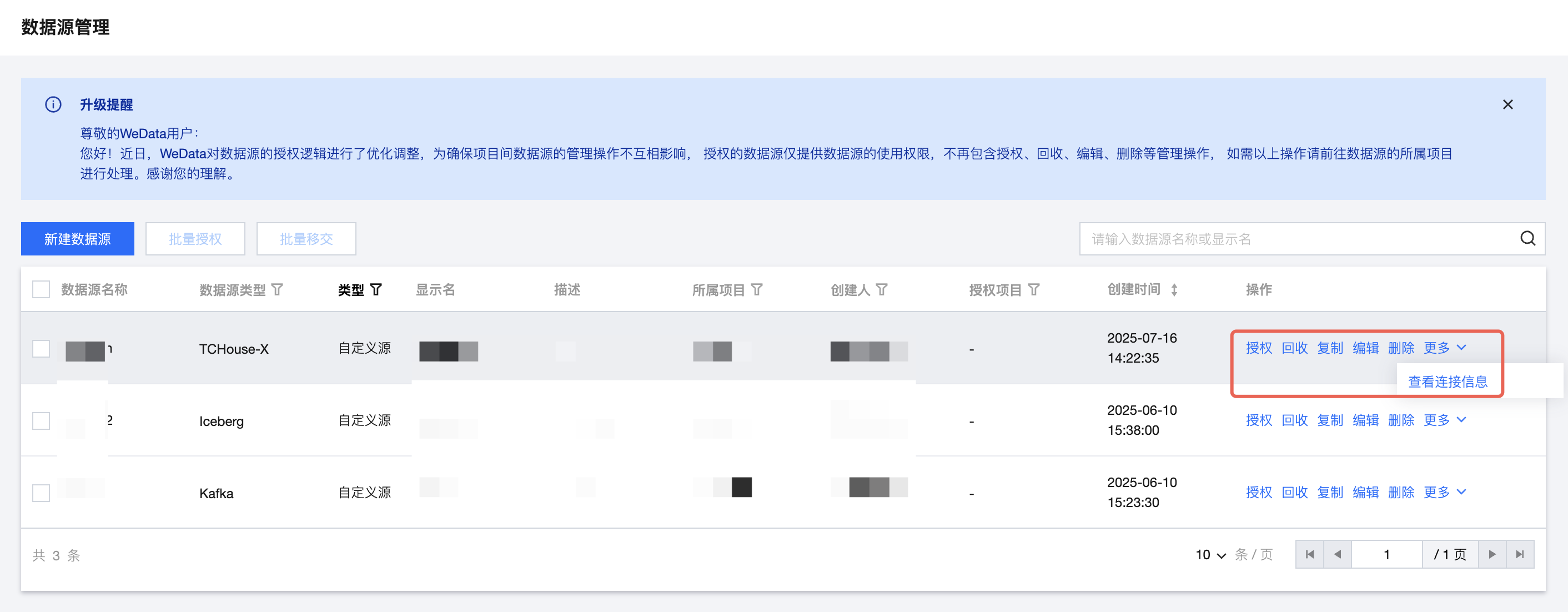 自定义源为用户在 WeData 中引入的数据源,目前支持 MySQL、Kafka、HDFS 等共计20+种数据源类型。自定义源支持查看连接信息、编辑、删除、授权与回收操作。