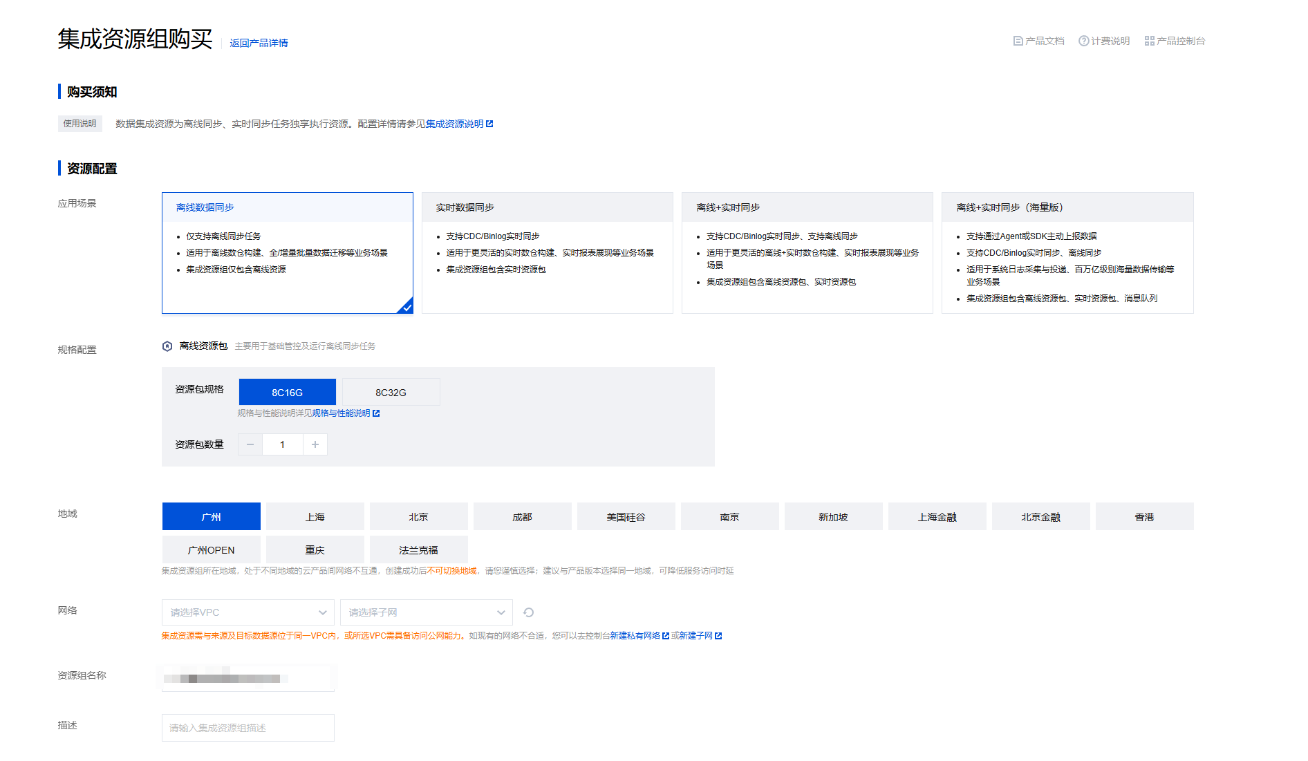 在选定集成资源组 页面下,单击创建,即可进入资源配置页面。