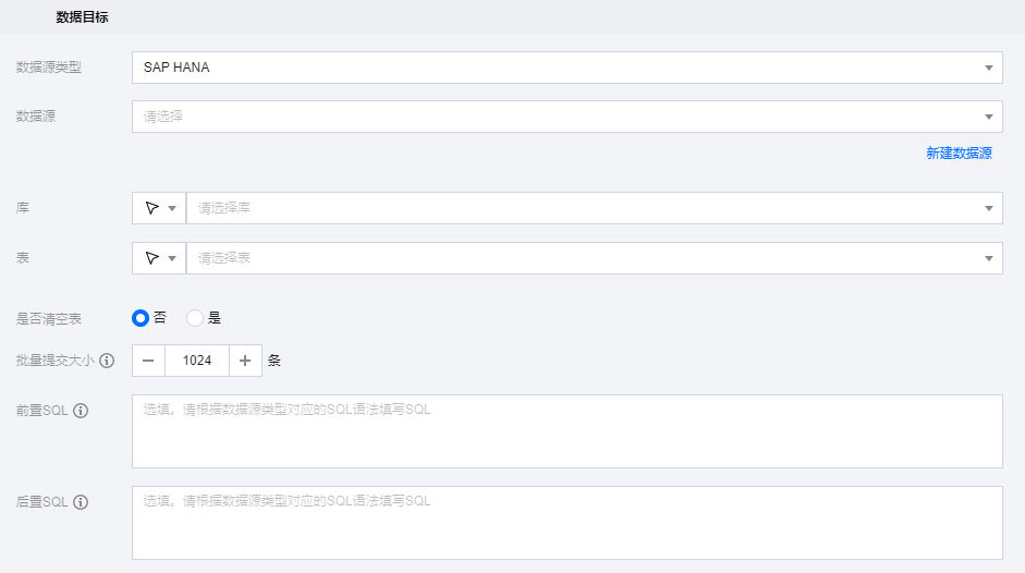 前置 SQL(选填) | 执行同步任务之前执行的 SQL 语句,根据数据源类型对应的正确 SQL 语法填写 SQL,例如,执行前清空表中的旧数据(truncate table tablename)。 |