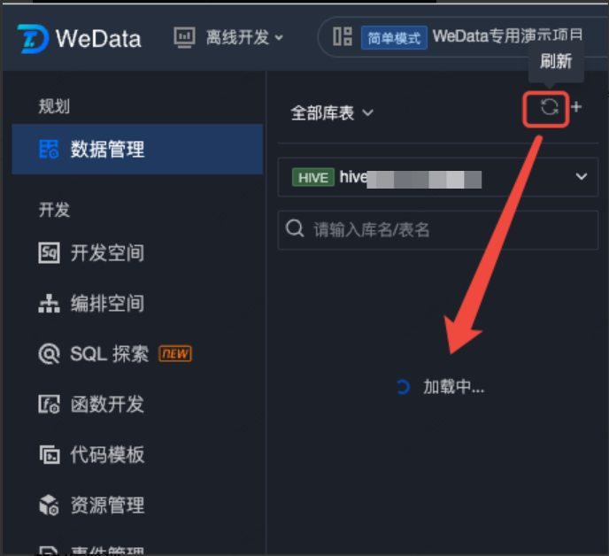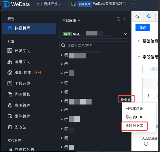 数据库 | 显示当前项目绑定的 Hive 数据库,根据数据源类型联动。支持按照库名称进行搜索。 |