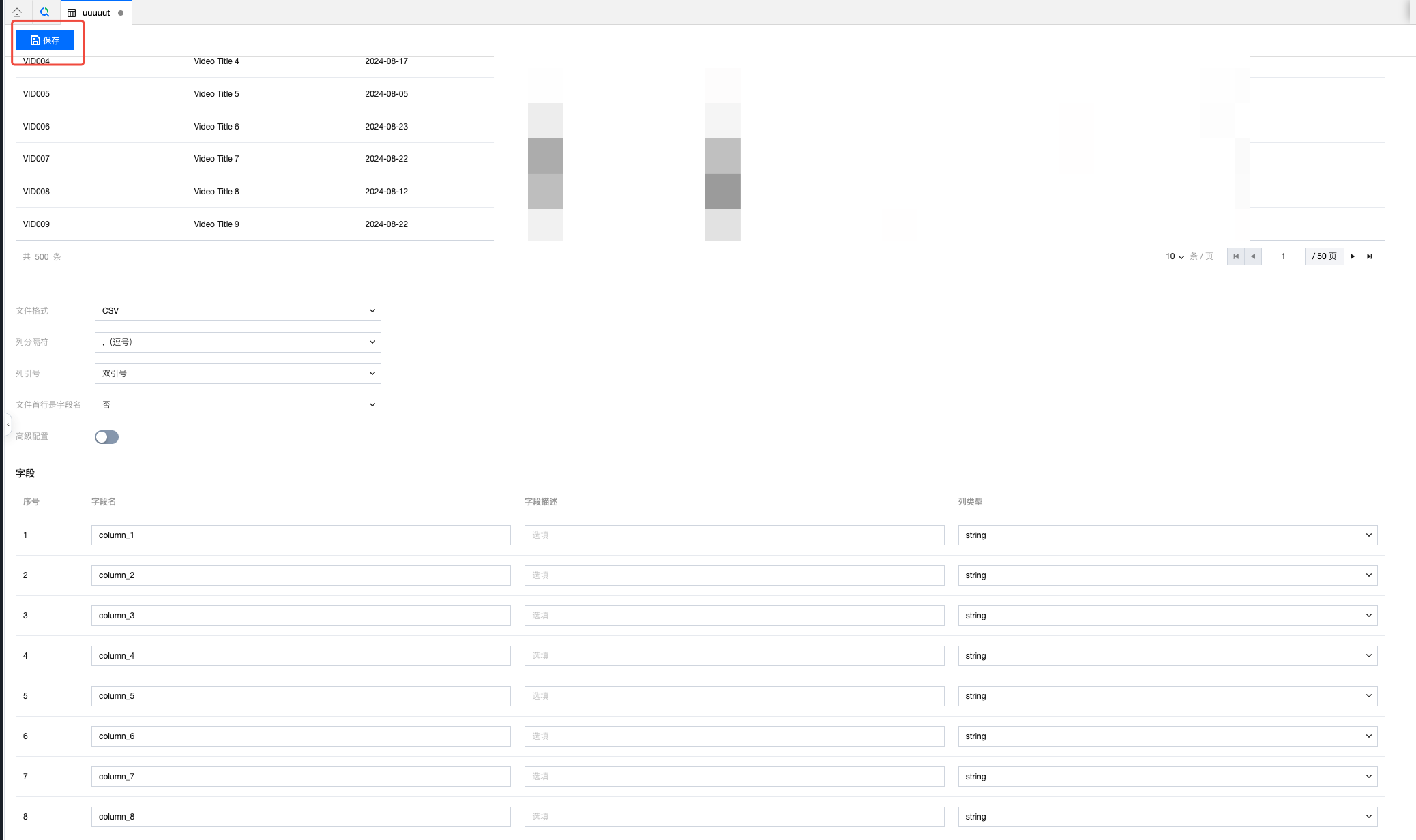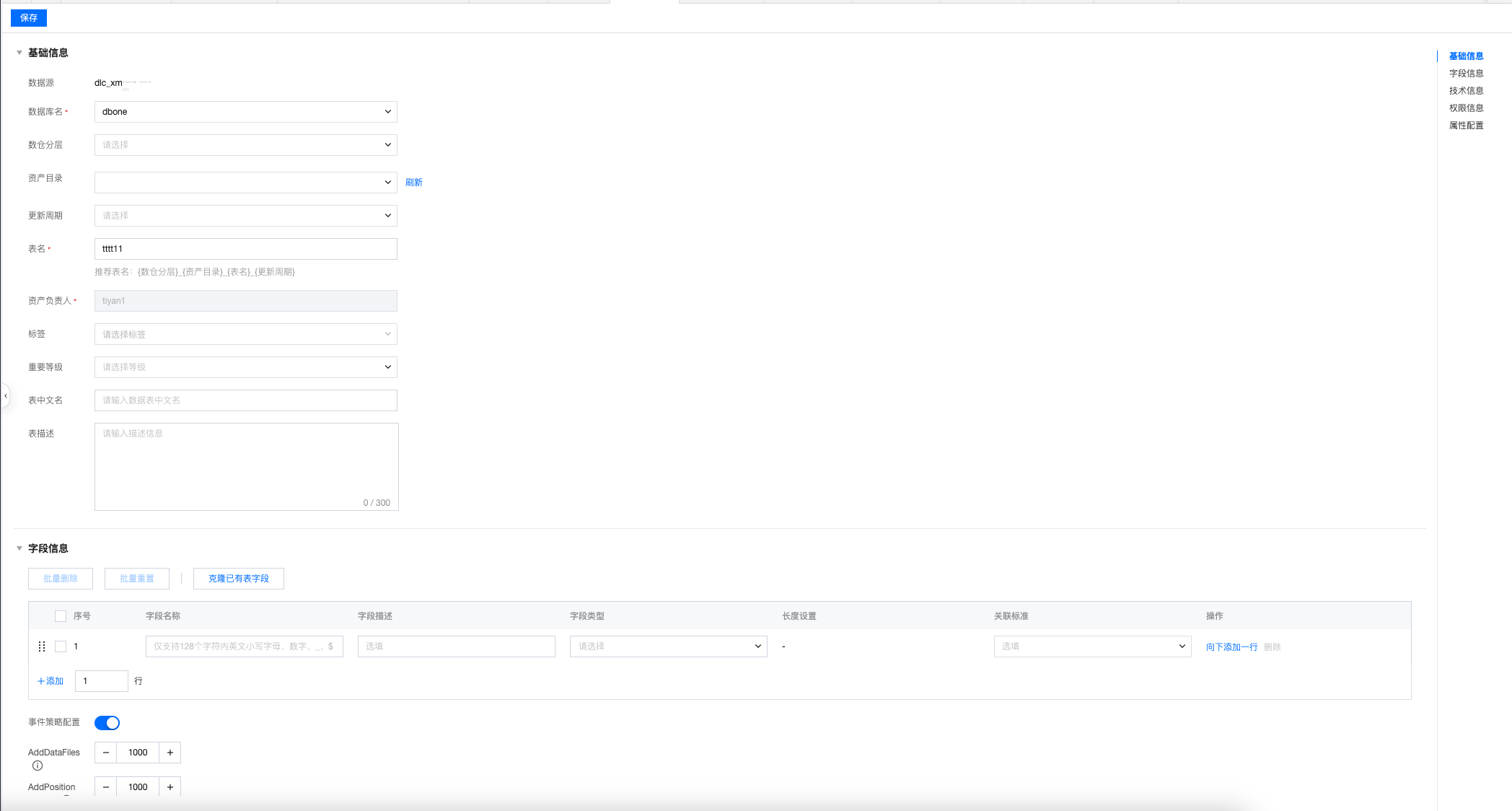 7. 在页面中将建表信息配置完成后,单击页面左上角保存,即可生成数据表。