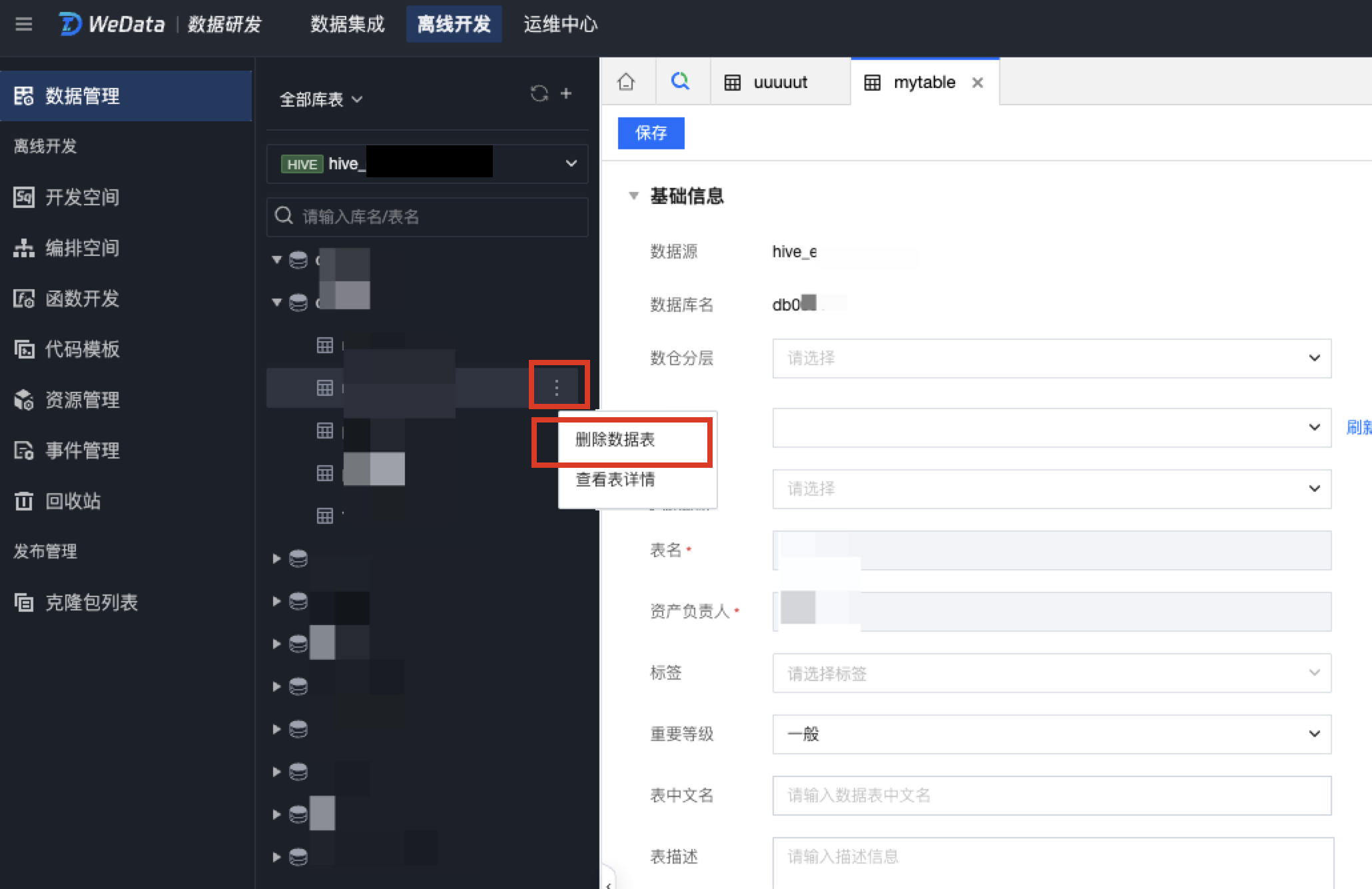 1. 在数据管理目录树中将光标移动到需要删除的数据表,单击
