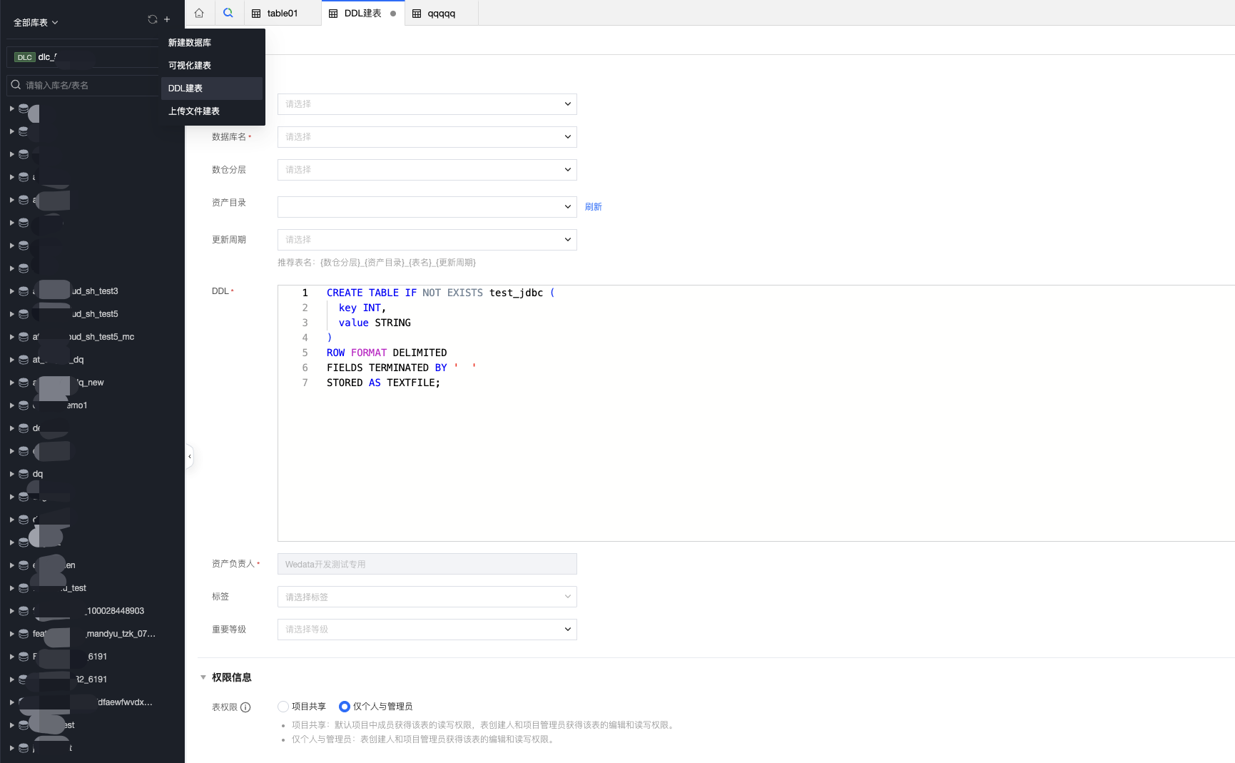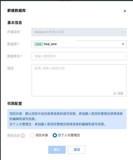 表权限 | 项目共享 将数据表权限归属于当前项目,项目内所有成员均会获得数据表权限,包括编辑、查询、删除等操作。 仅个人与管理员 将数据表权限归属于创建者个人与当前项目的管理员。 (说明:数据权限生效时间预计需要30秒左右) |