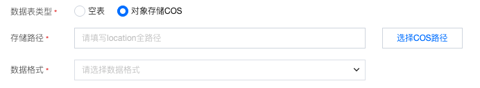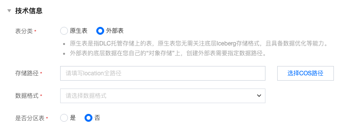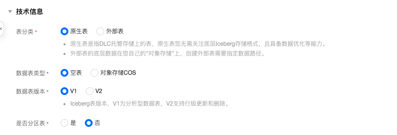 技术信息 | 表分类 | 可选择创建原生表或外部表。 原生表: ![]() 数据表类型:可选择“空表”,“对象存储COS”,当选择“对象存储COS”,需要指定COS路径和数据格式: 数据格式:支持CSV、JSON、PARQUET、ORC、AVRO。 ![]() 数据表版本:选择 V1 或 V2 的数据表版本,选择 V2 的数据表版本时,可以选择是否使用 upsert 写入。 外部表: ![]() 存储路径:对象存储 COS 与外部表需要填写 location 全路径。 数据格式:支持CSV、JSON、PARQUET、ORC、AVRO。 |