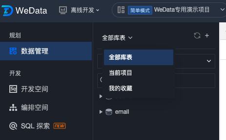 当前项目:展示当前数据源下归属项目为当前项目的所有库表数据。
