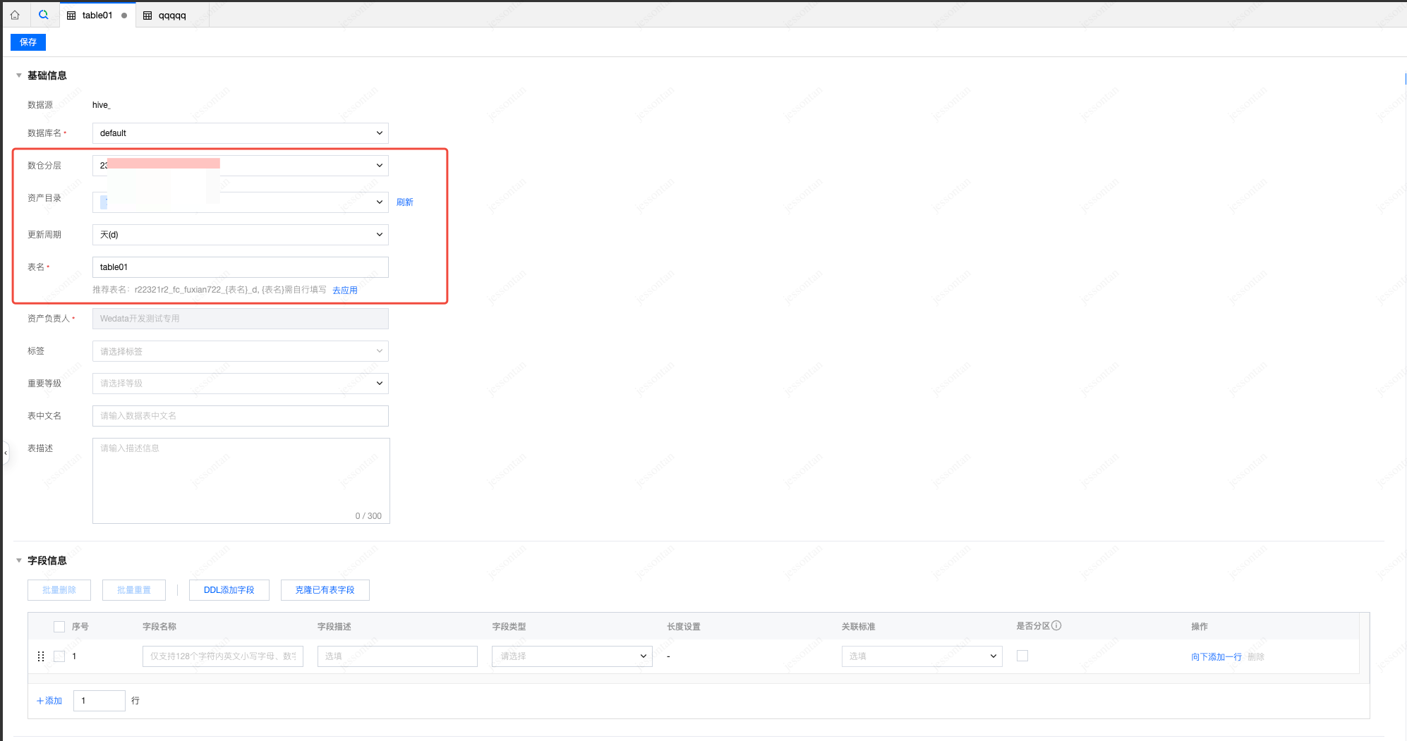 2. 将新建表弹框中的基本信息填写完成后,即可进入数据表设计页面,需要配置表基础信息、字段信息等。注意在建表时,可以设置该表对应的“数仓分层”、“资产目录”、“更新周期”,系统会据此给出推荐表名,用户点击去应用则可以将推荐表名填充。规范表名更利于对数据表的统一管理和维护。