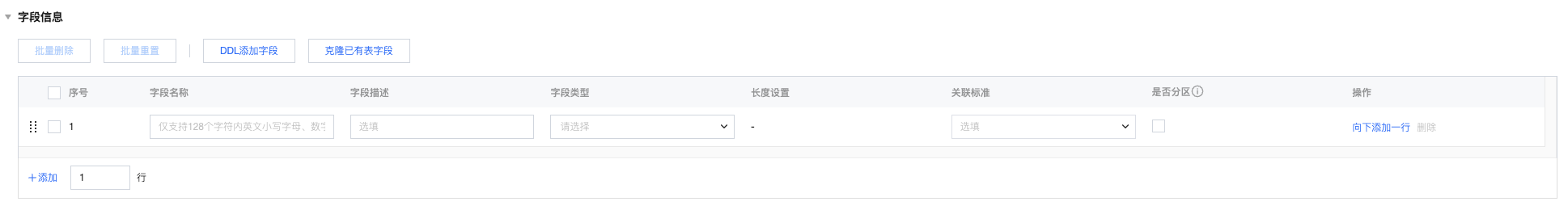 字段配置 | 一个字段包含字段名、字段描述、列类型、是否分区等配置信息。 分区字段说明:字段不能全选为分区字段,至少要有一个非分区字段。分区字段不支持array、map、decimal类型。 |