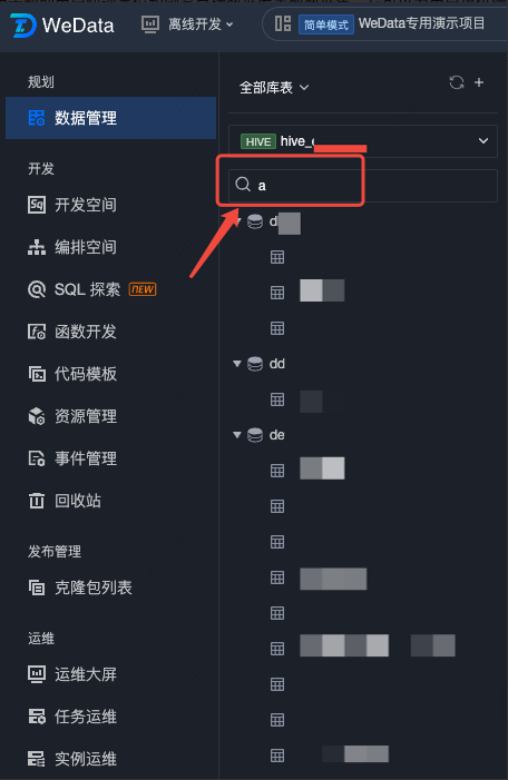 在搜索窗口输入数据库或数据表名称,库表目录即可搜索到对应名称的库表结构。搜索功能支持模糊检索。
