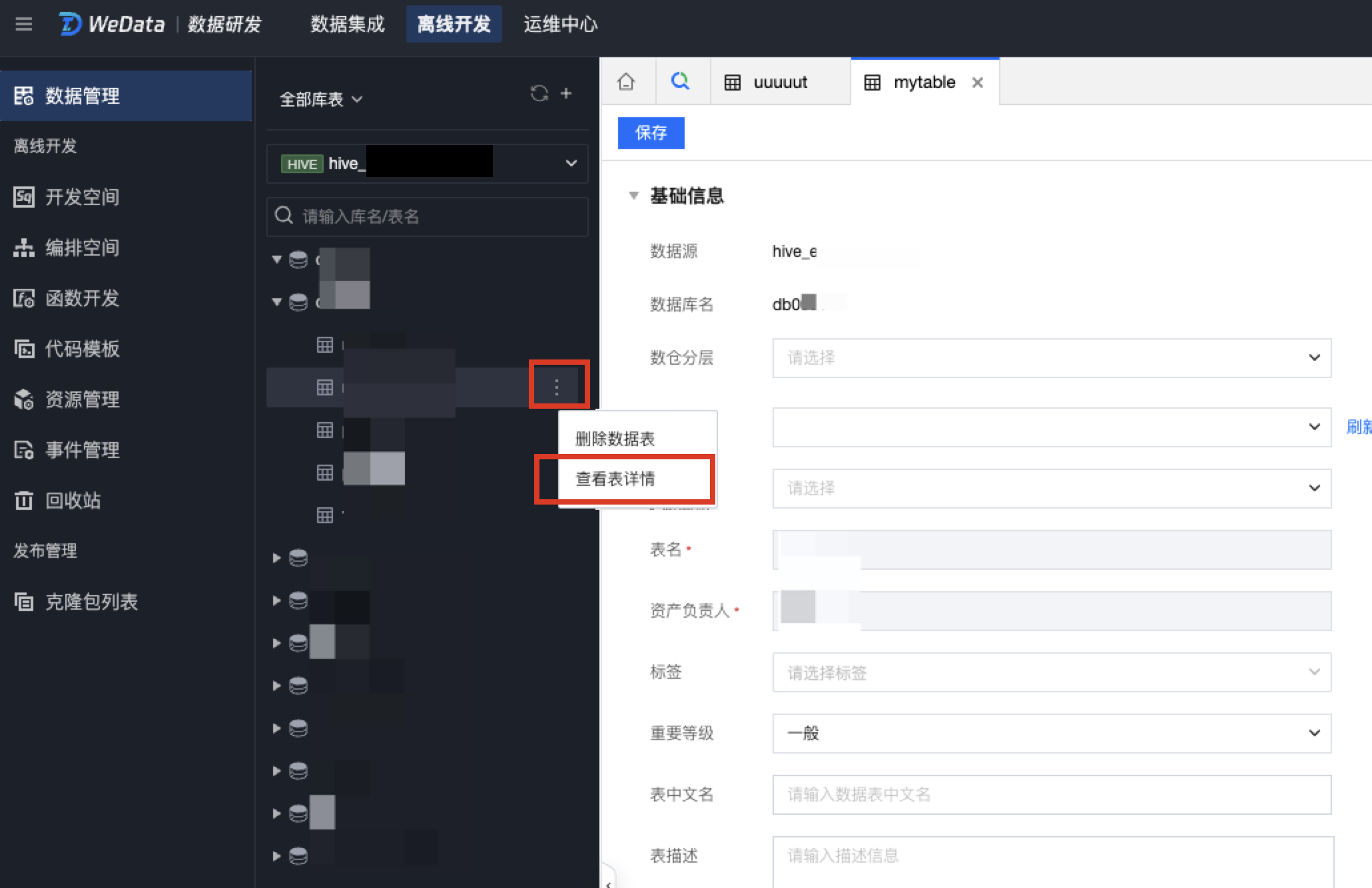 在数据管理目录树中将光标移动到需要查看详情的数据表,单击