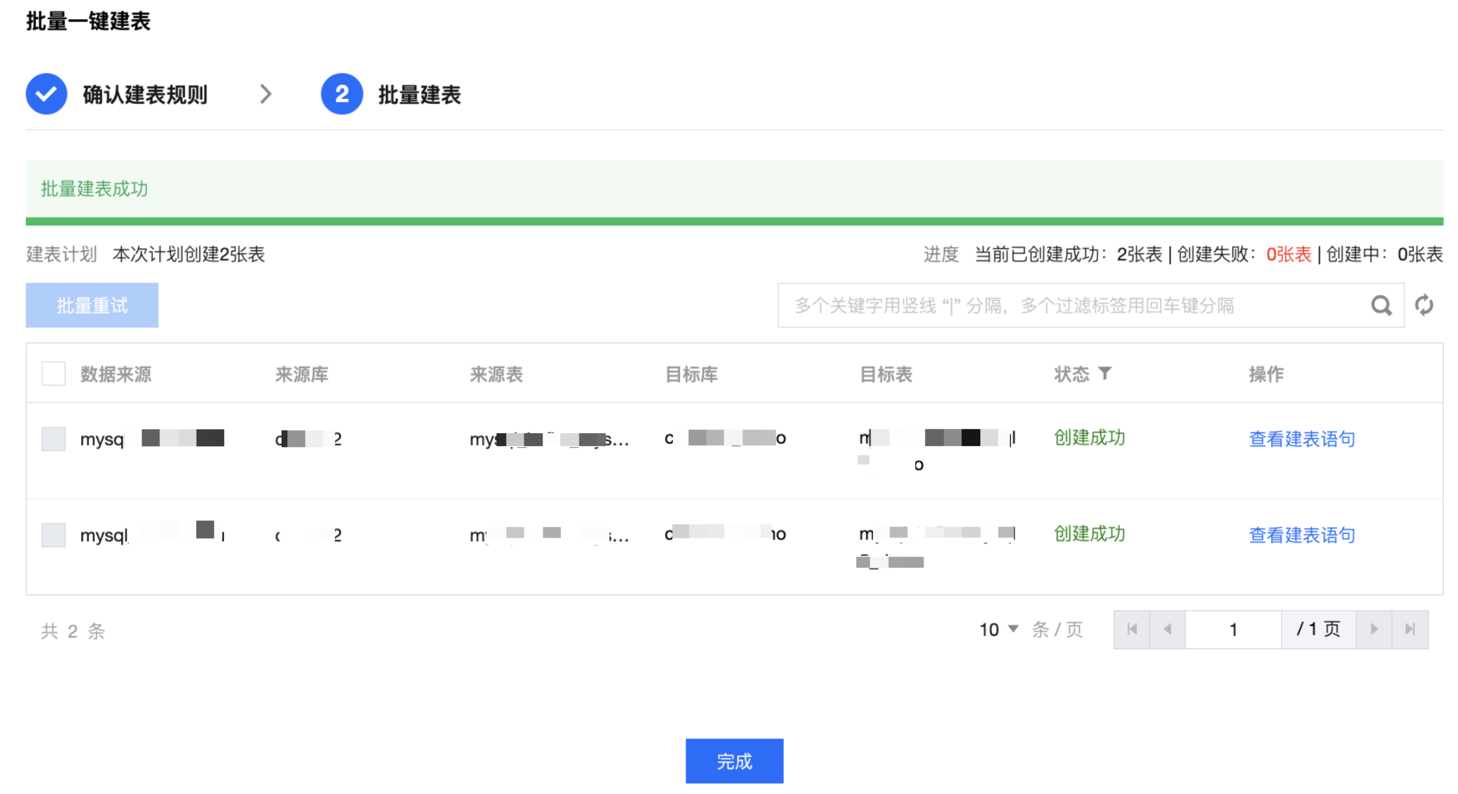 一键建表 | ![]() | 此功能可根据来源端指定的多个表对象自动完成来源至目标端的 DDL 转换,支持用户手动修改转换后的 DDL 内容,并一次性批量创建。