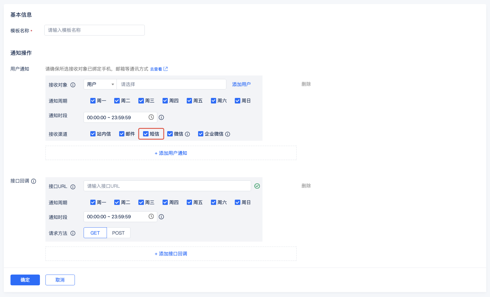 3. 在新建通知模板页配置完基础信息后,在告警接收渠道勾选短信。