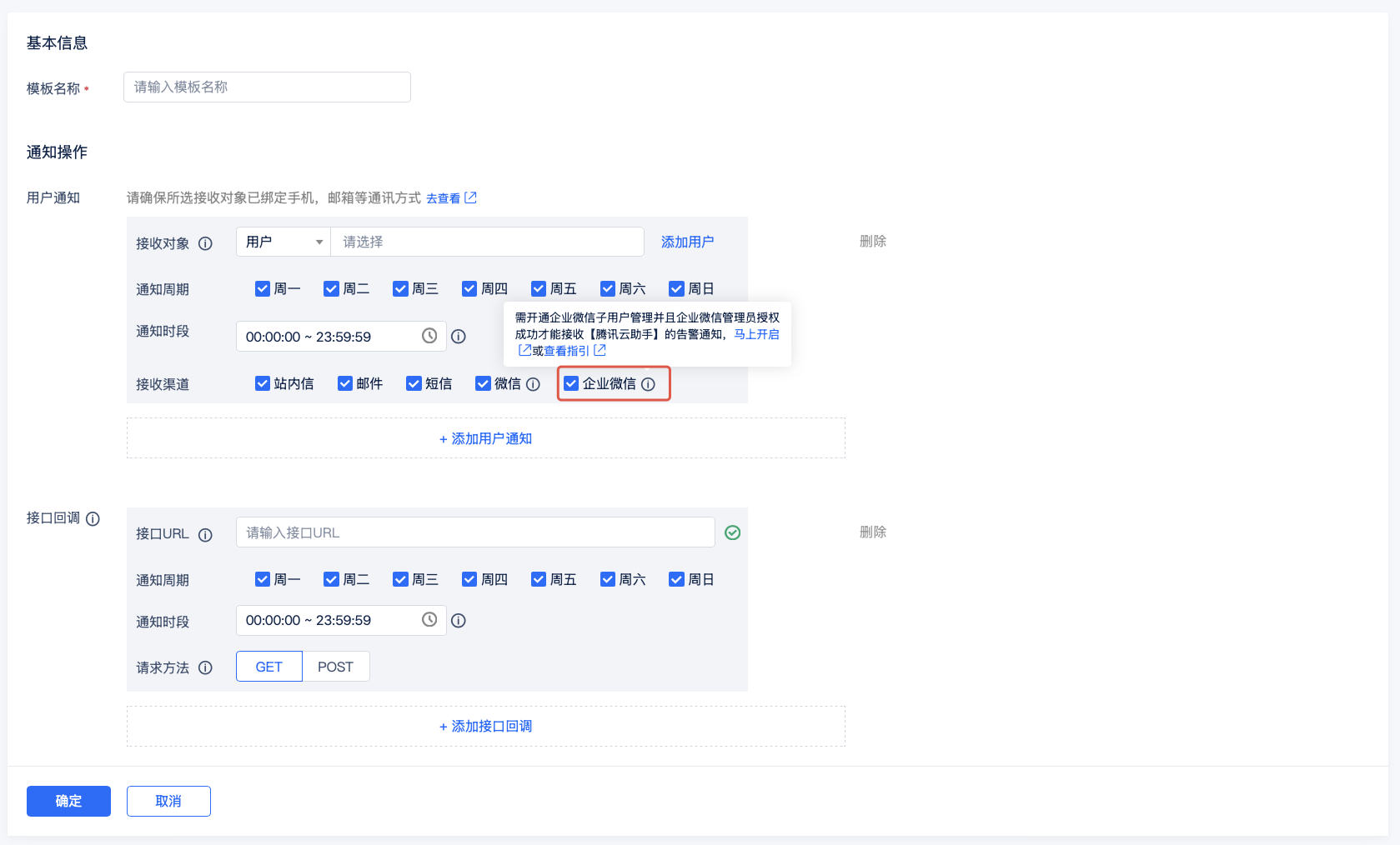 3. 在新建通知模板页配置完基础信息后,在告警接收渠道勾选企业微信。