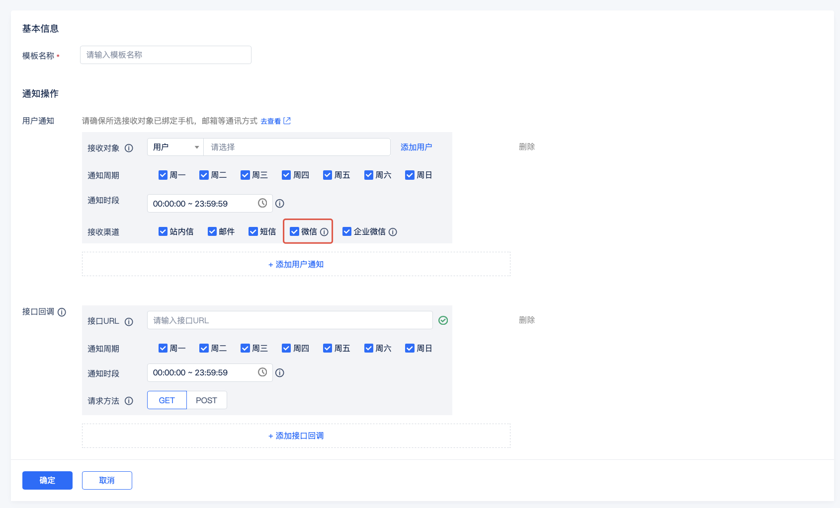 3. 在新建通知模板页配置完基础信息后,在告警接收渠道勾选微信。