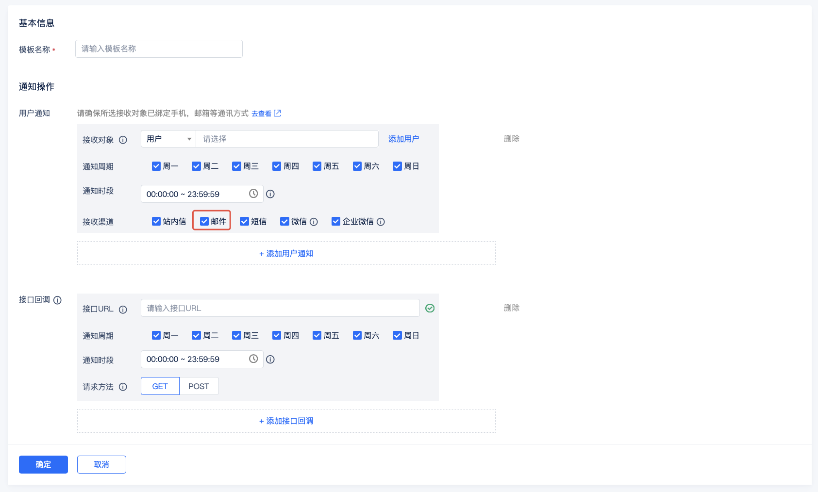 3. 在新建通知模板页配置完基础信息后,在告警接收渠道勾选邮件。