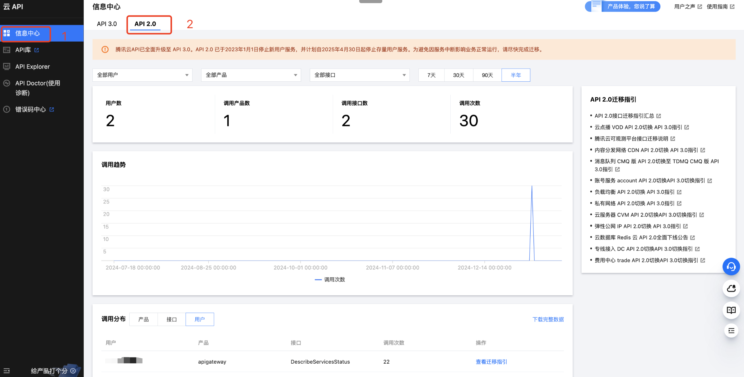 在 云 API 控制台 信息中心的 API 2.0 页面,您可以查看到当前账号及其子账号的 API 2.0 调用数据,包括用户数、产品数、接口数、调用次数等。如需查看调用了哪些接口,可在“调用分布”模块将维度切换到「接口」;如需查看有哪些子账号调用了 API 2.0 接口,可在“调用分布”模块将维度切换到「用户」。利用这些数据,您可以排查服务中具体的 API 2.0 调用情况,然后参考以下指引完成接口迁移。更多数据看板功能说明请参见 API 2.0 使用手册。