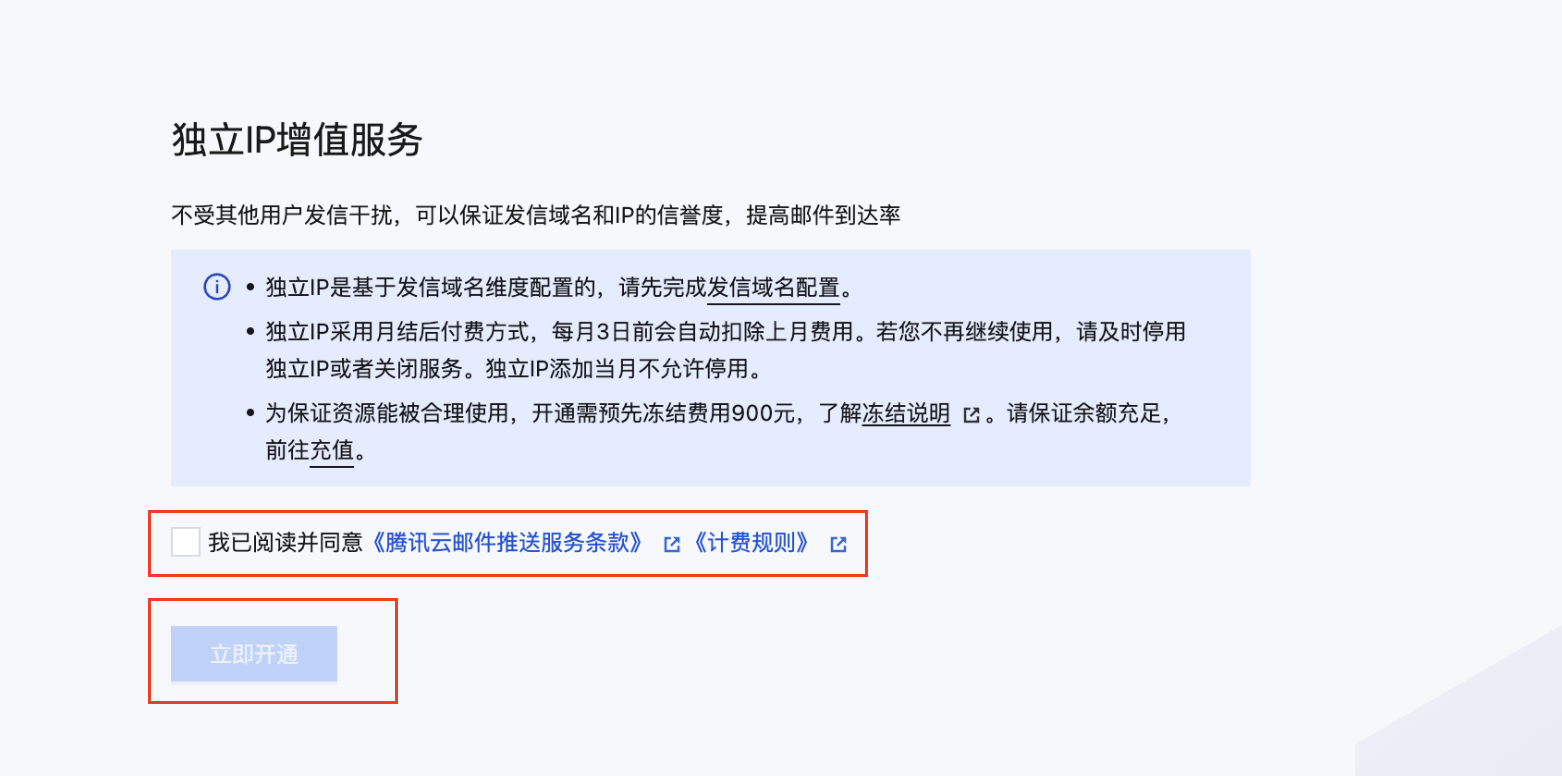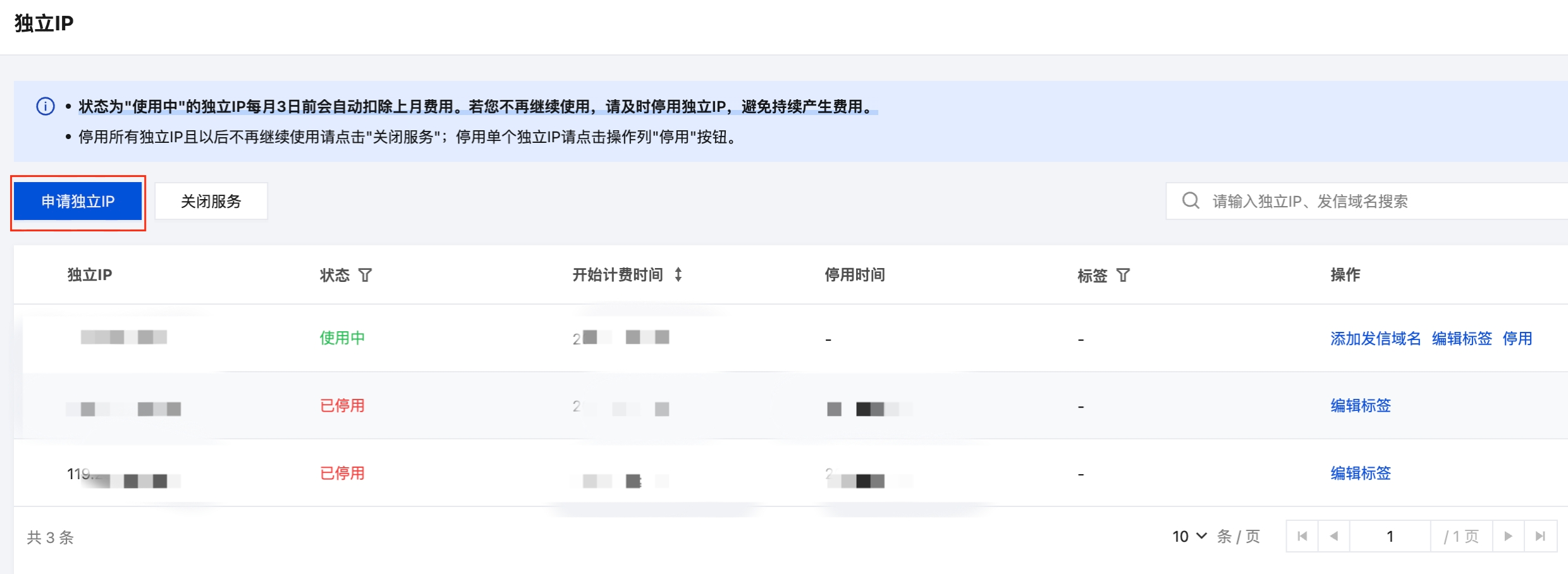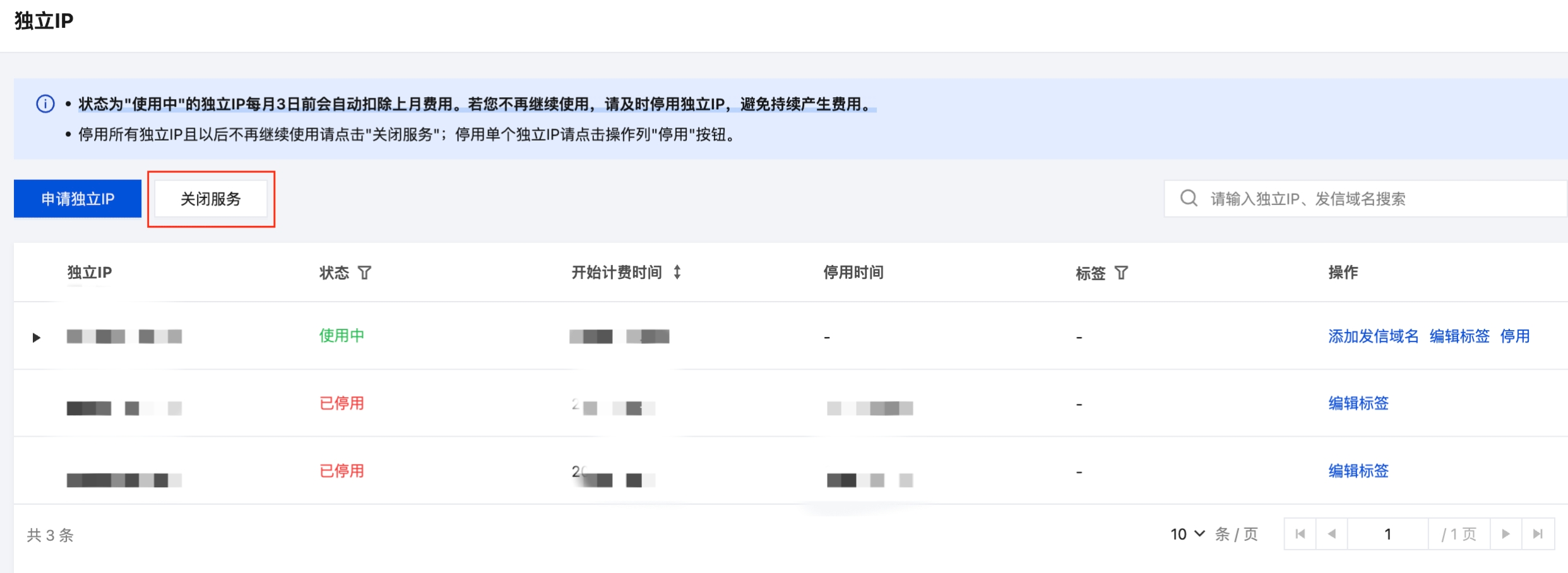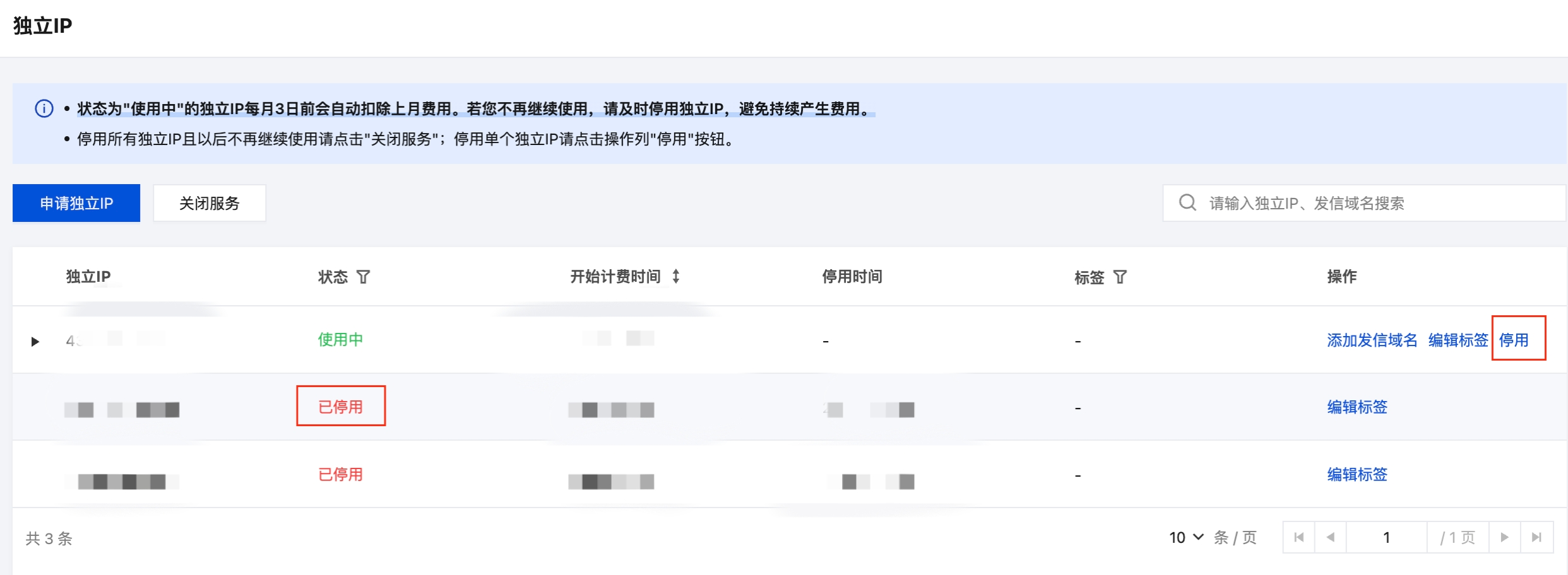 若您因为一些原因不再继续发送邮件或者使用某独立IP,请及时停用,避免持续产生费用。