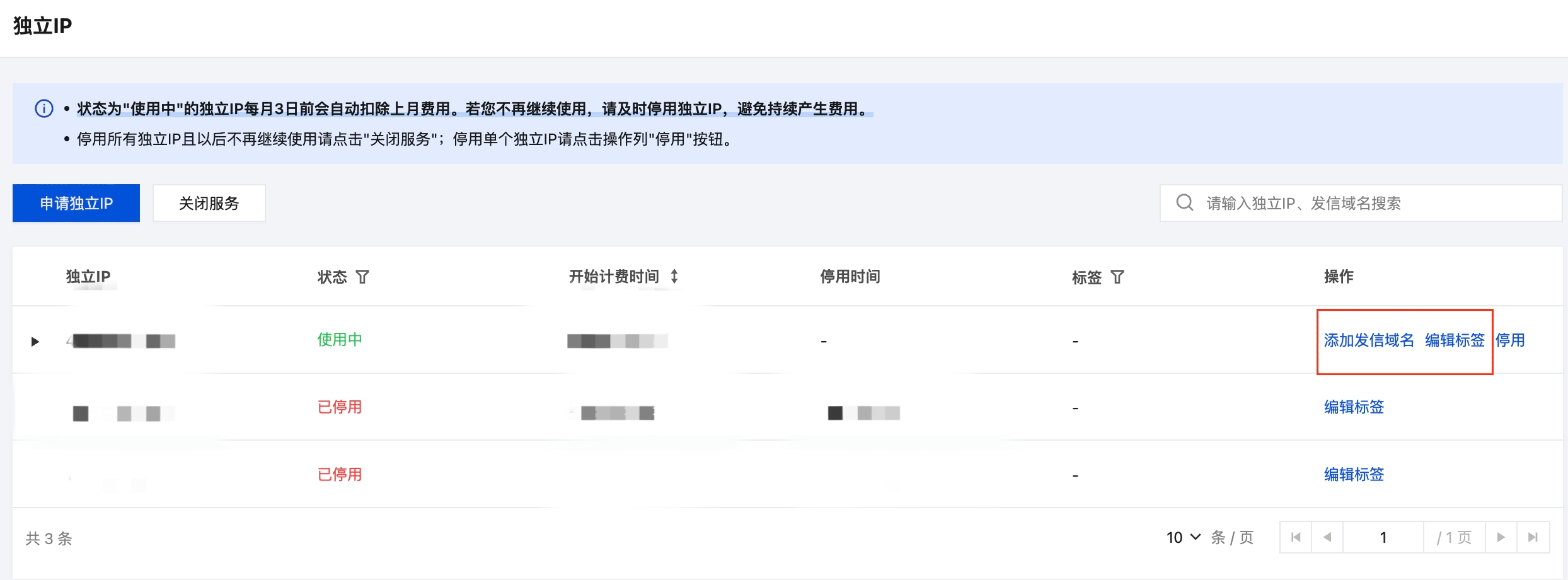 独立IP下发成功后将会开始正式计费。您可以进行添加发信域名操作和编辑标签操作。
