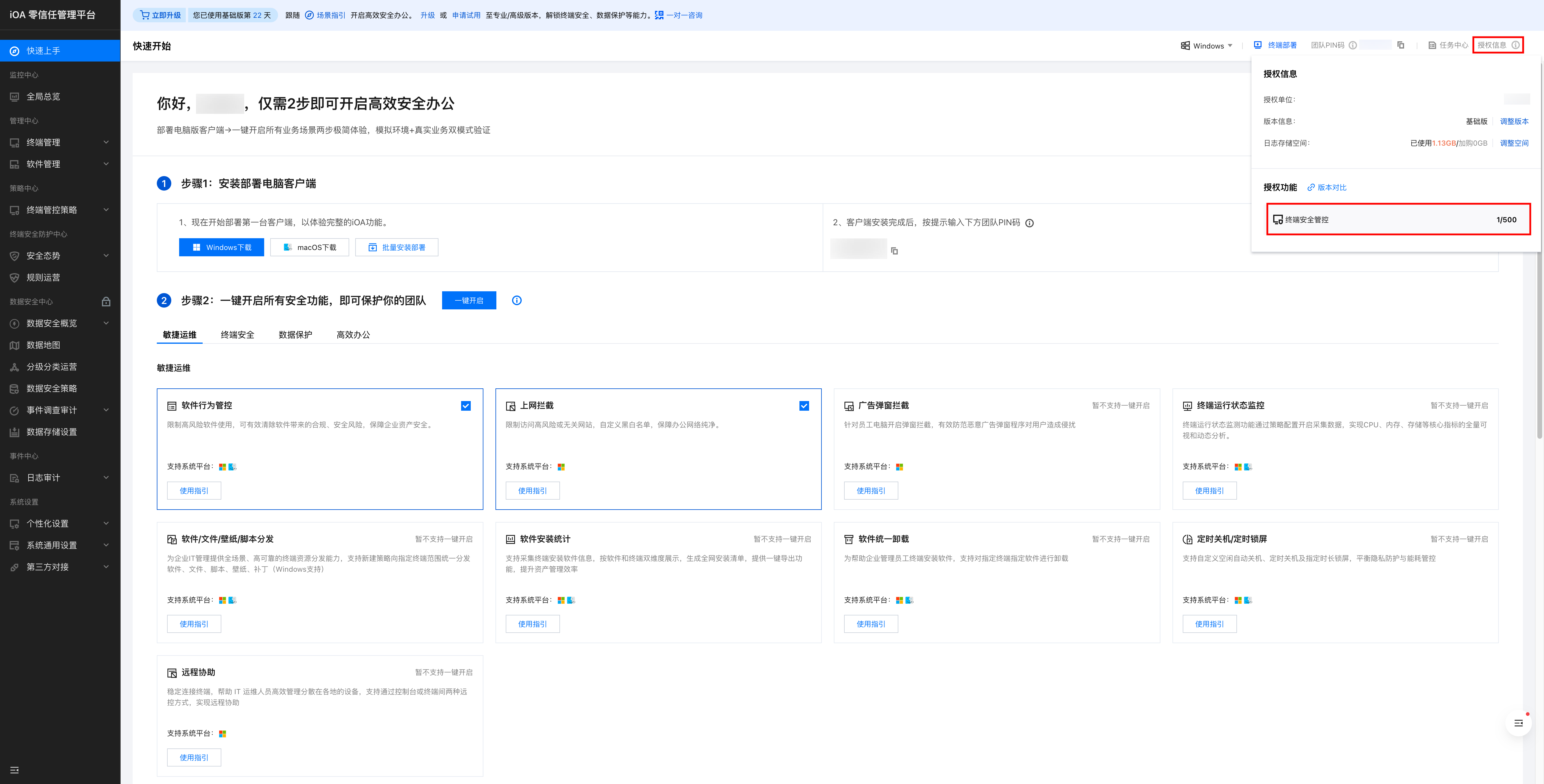 2. 在开通界面进行留资,留资完成后将为您自动免费开通 iOA 基础版。开通完成后可在授权信息内查看免费使用的终端数量限制。