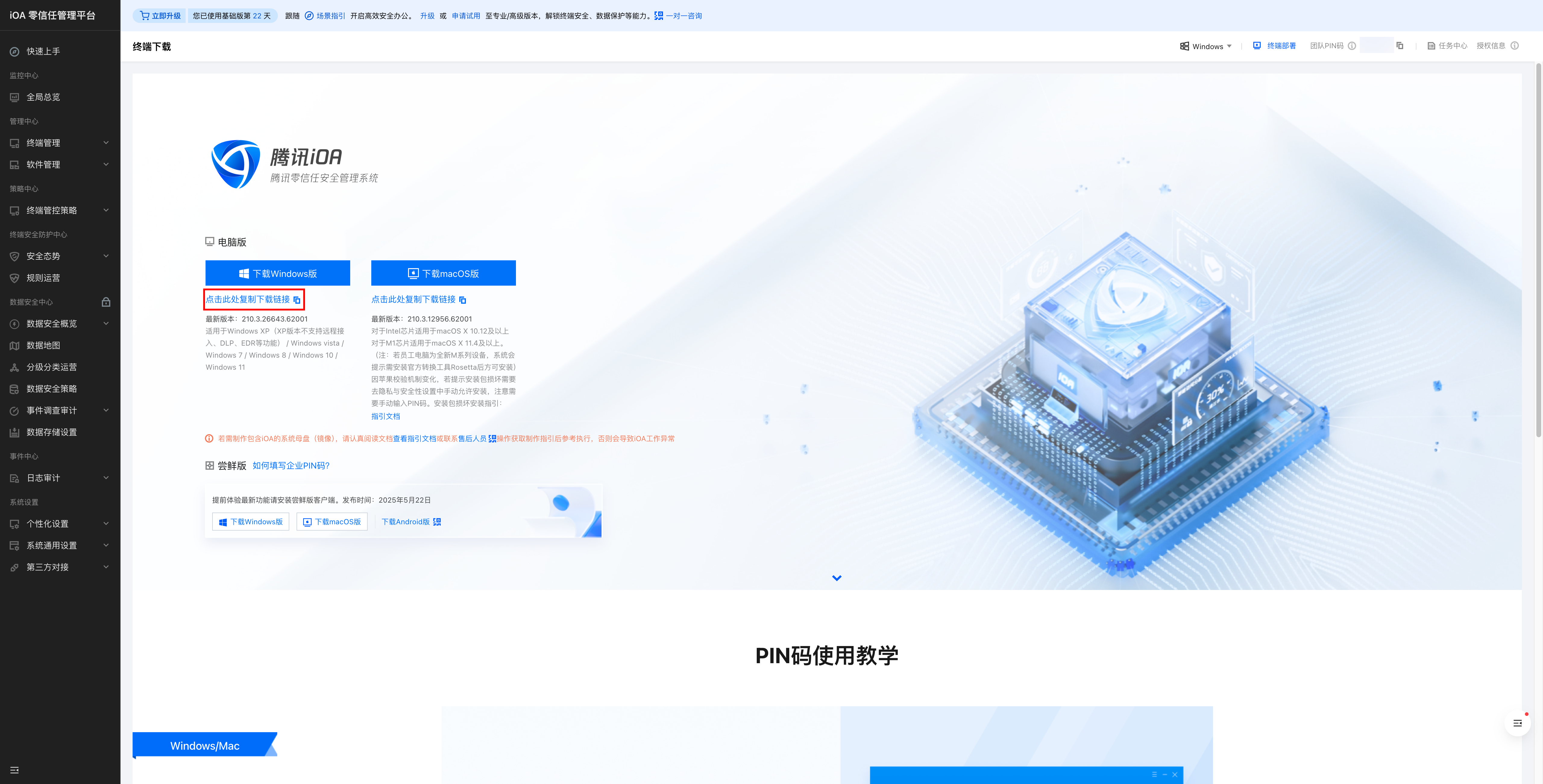 1. 在腾讯 iOA 控制台 终端部署 页面,复制客户端下载链接。