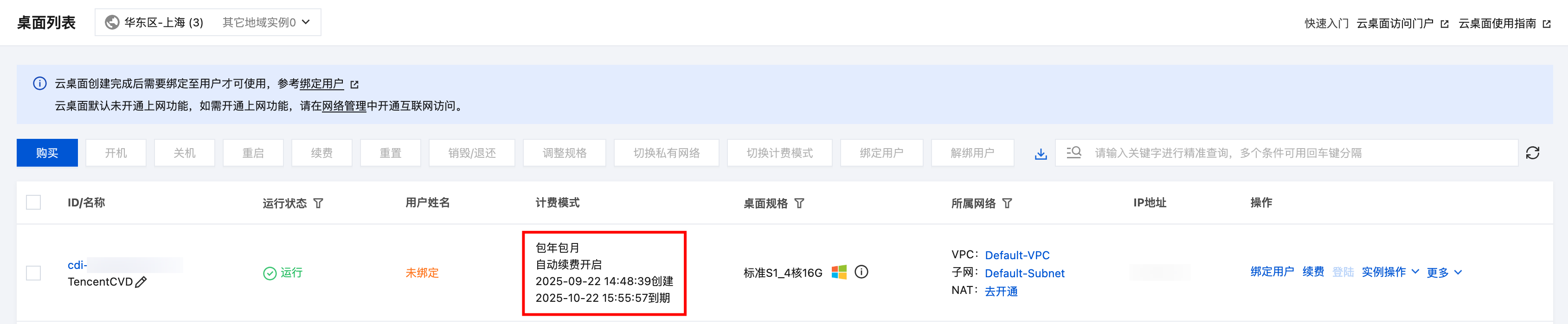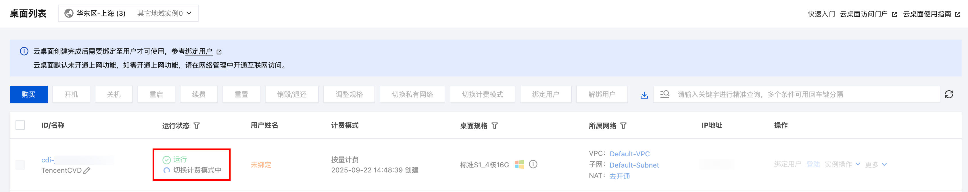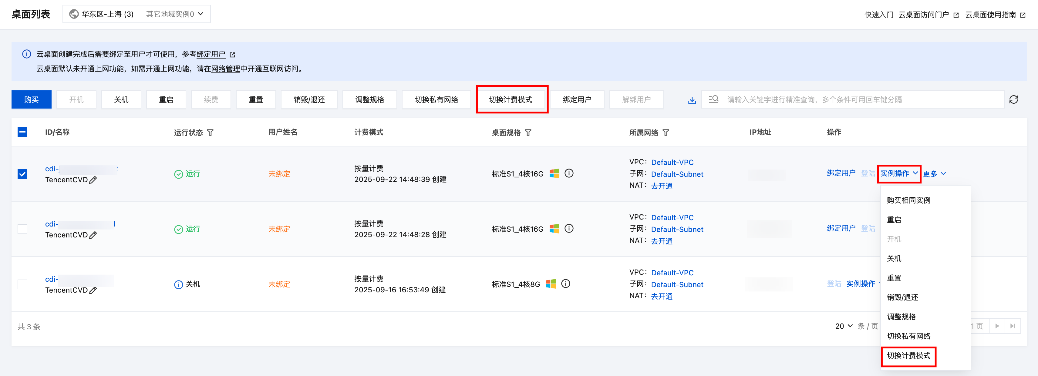 批量切换计费模式时,单次最大限制为20台云桌面实例。