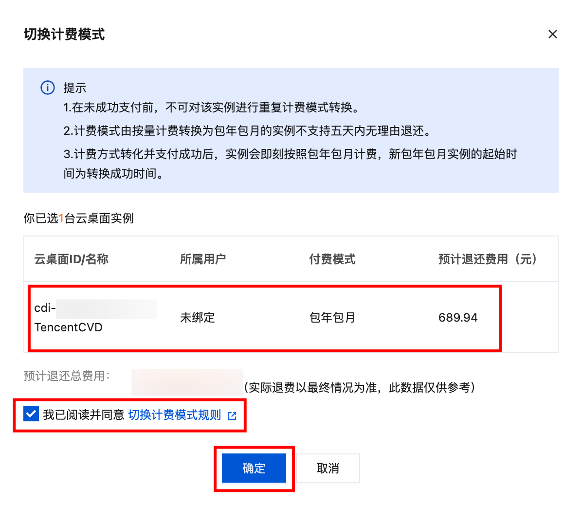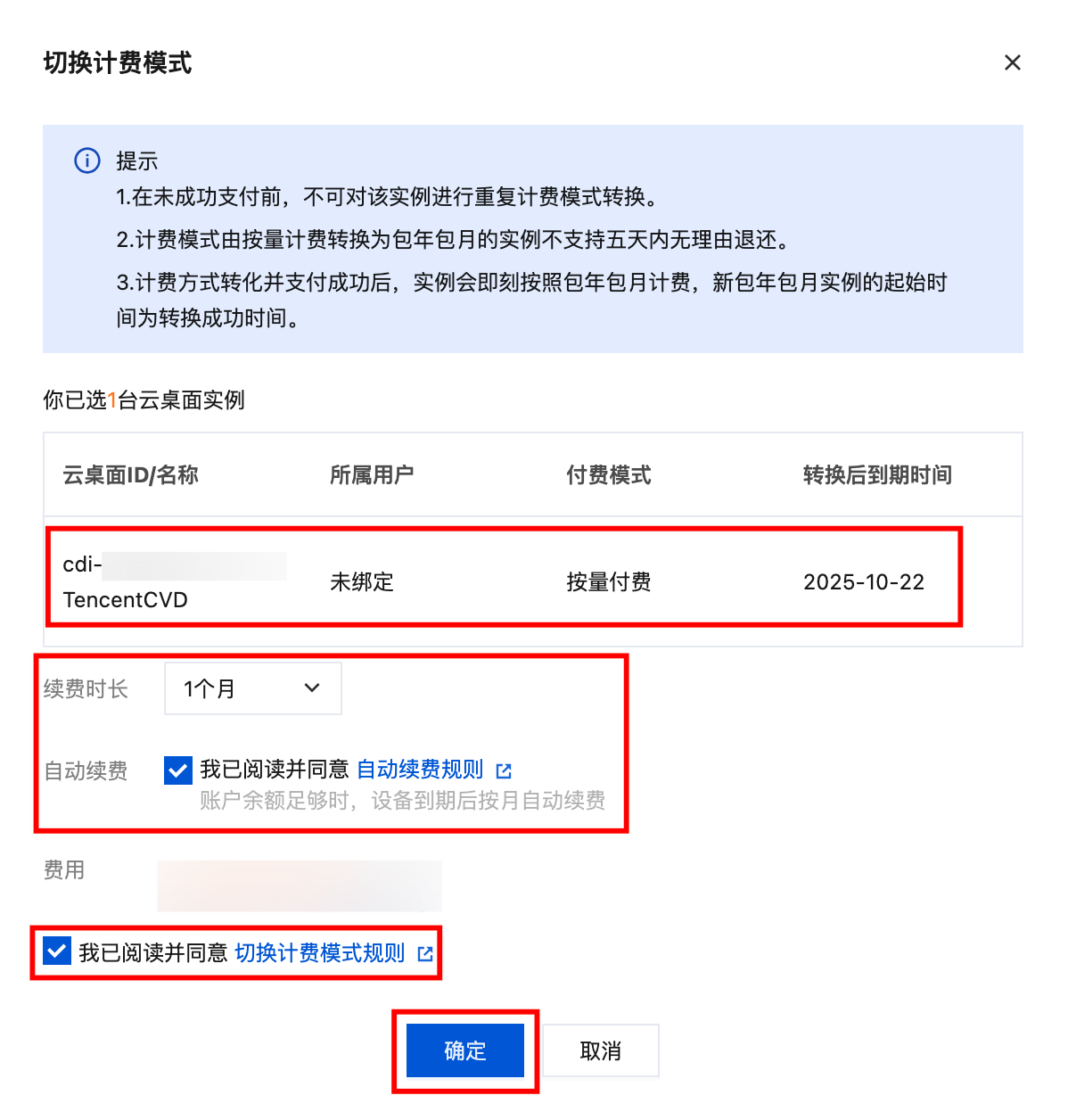 3. 切换计费模式弹窗内,确认云桌面实例信息及价格信息,单击确定进行切换。