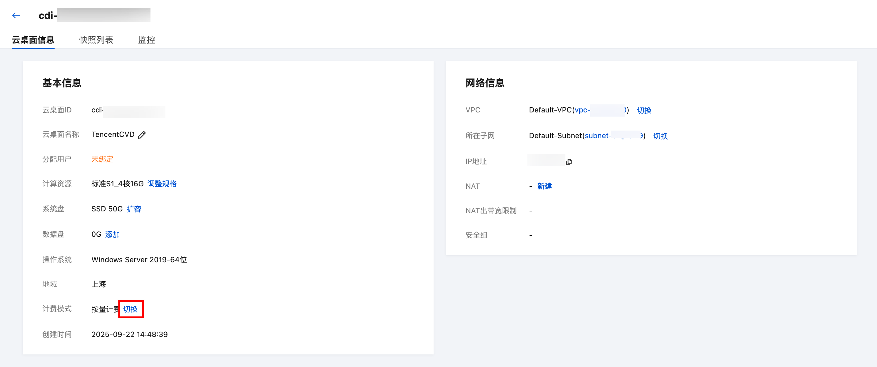 单击目标云桌面 ID 进入云桌面信息,在云桌面实例详情页内单击计费模式旁的切换。