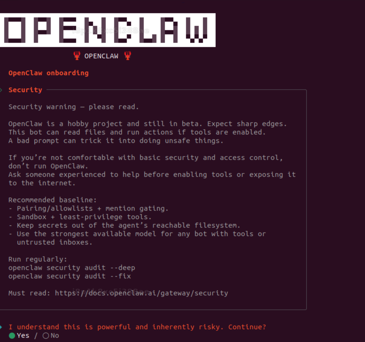 6. 运行上述命令后,将返回如下问题:我明白它功能强大,但也存在固有风险。是否继续?(I understand this is powerful and inherently risky. Continue?)请充分了解相关风险后,输入 Yes。相关风险说明请参见 OpenClaw 社区文档。