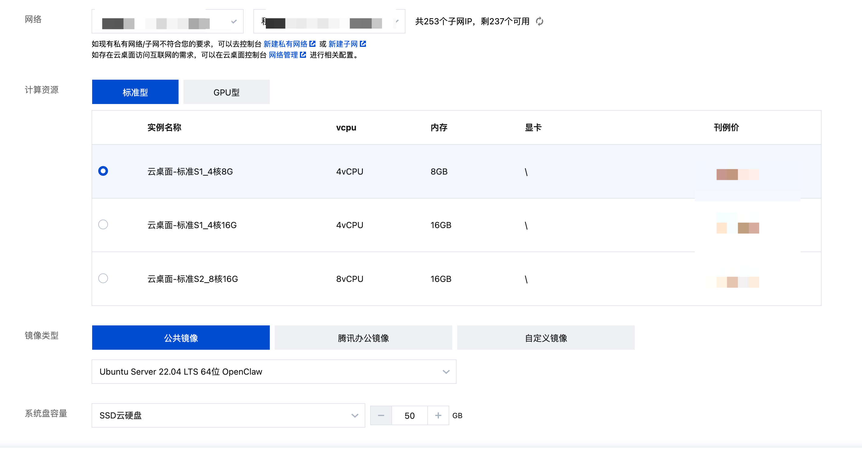 2. 根据需要选择所需配置完成云桌面购买,在公共镜像中选择预装了 OpenClaw 的镜像,其余配置可根据需要选择。