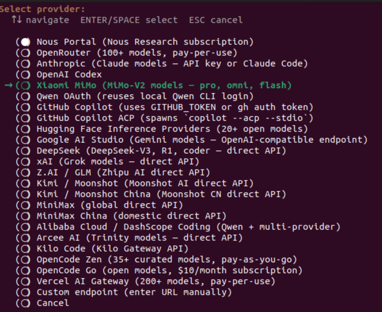 hermes model,使用键盘的上下键选择您想使用的大模型供应商,回车确认。