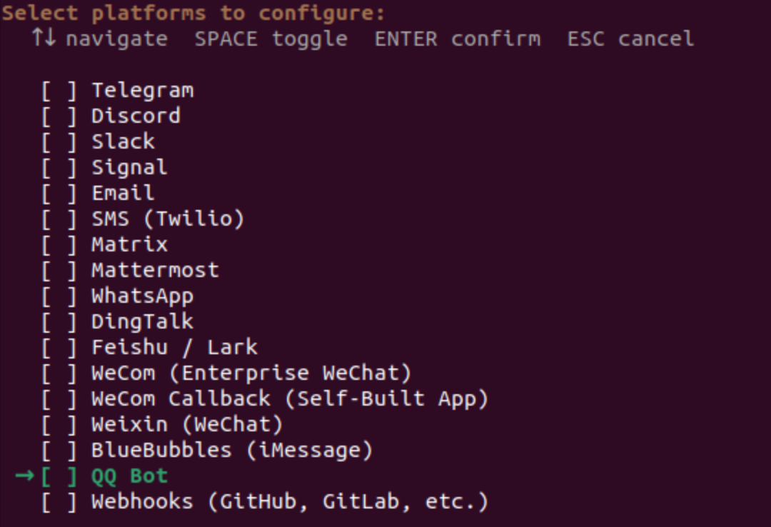 hermes setup gateway,使用上下方向键选择 QQ Bot 并回车。