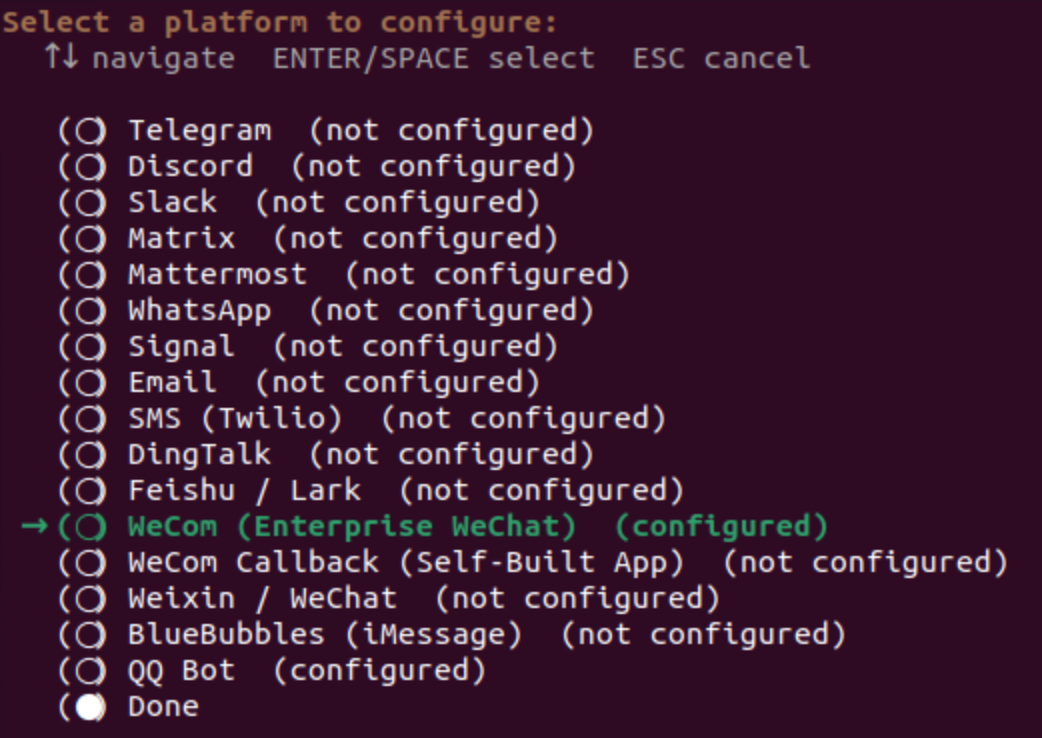 hermes setup gateway,使用上下方向键选择 WeCom (Enterprise WeChat) 并回车。