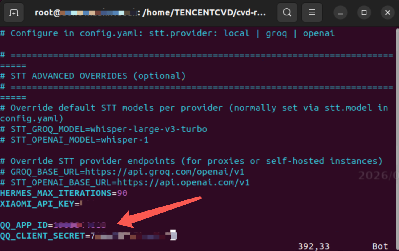 vim ~/.hermes/.env ,打开环境变量配置,添加 QQ_APP_ID 和 QQ_CLIENT_SECRET。更多配置可参考 Hermes Agent QQ Bot 配置文档。
