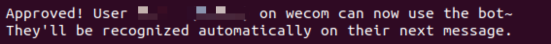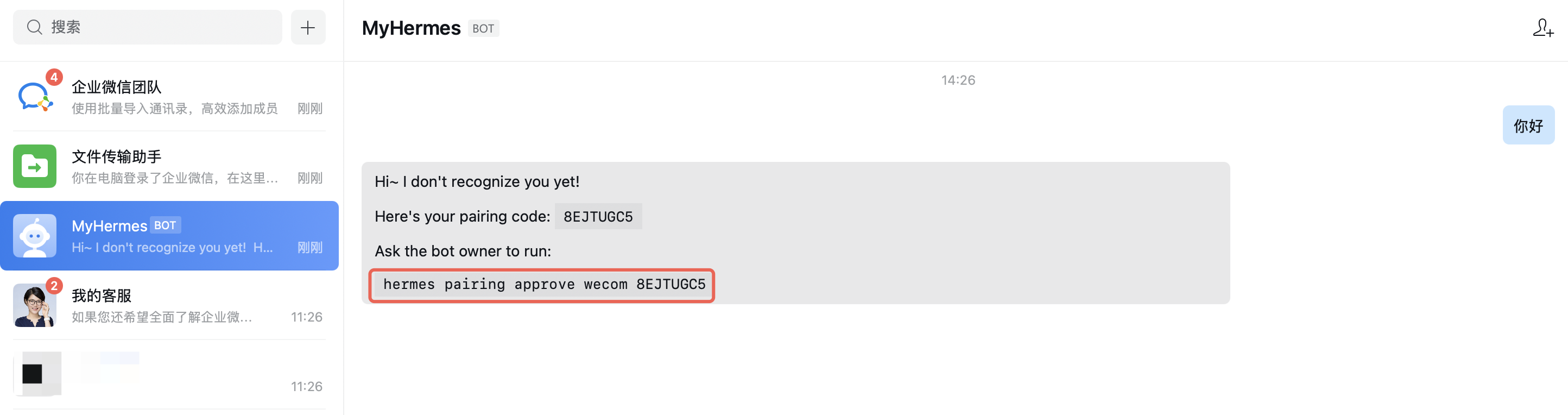 hermes pairing approve wecom xxxxxx,回到终端粘贴并回车运行,看到如下信息,表示配对完成。