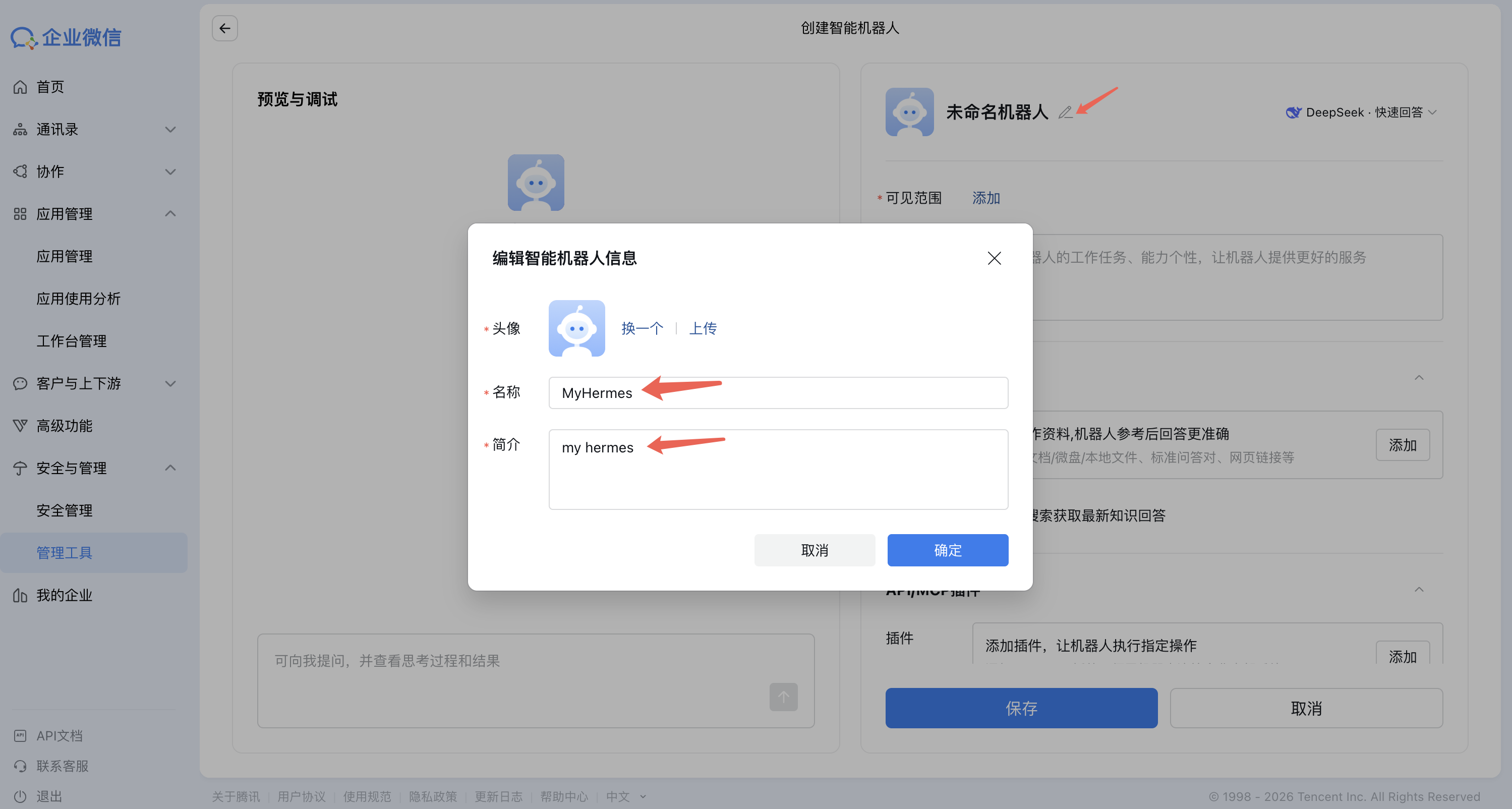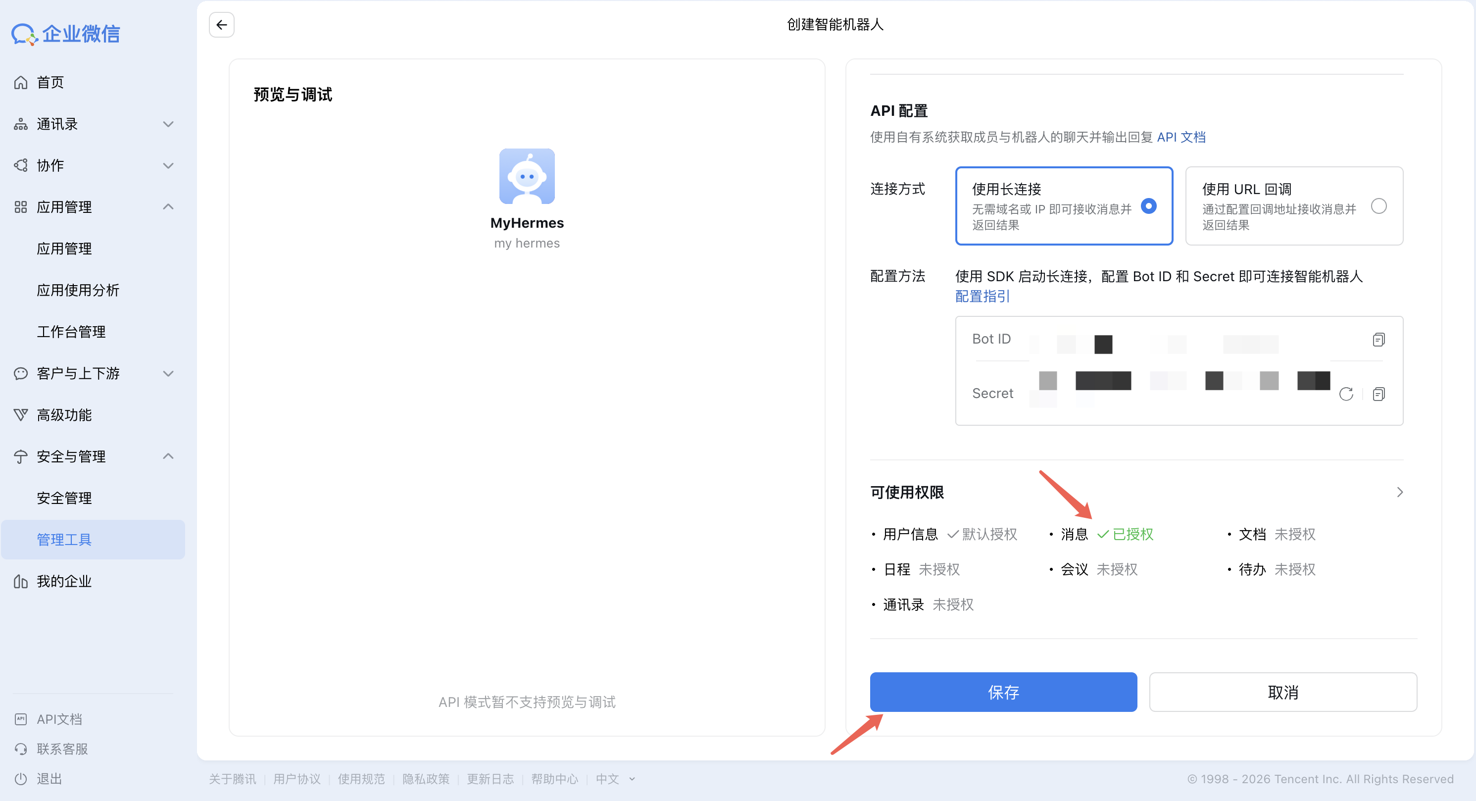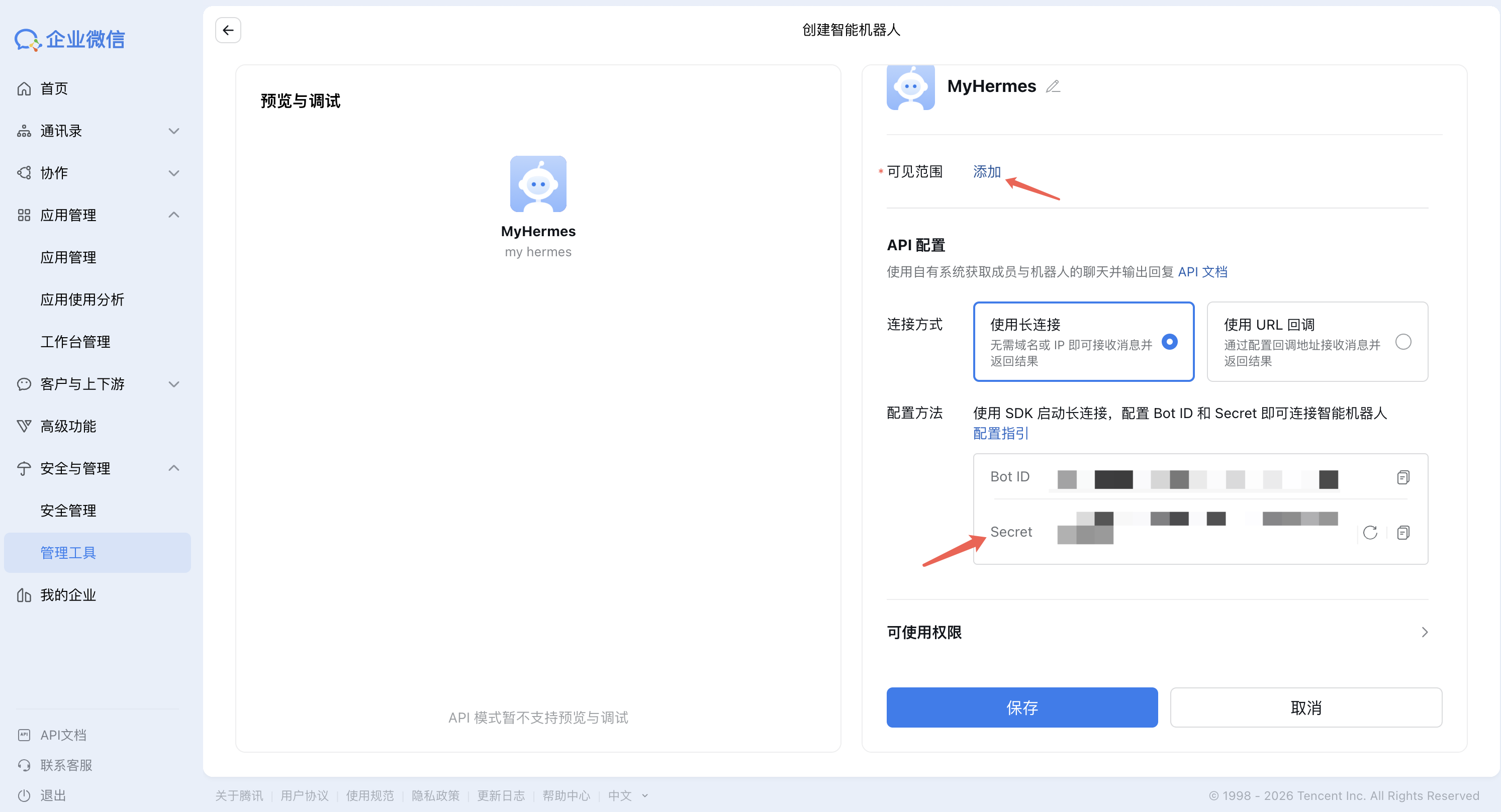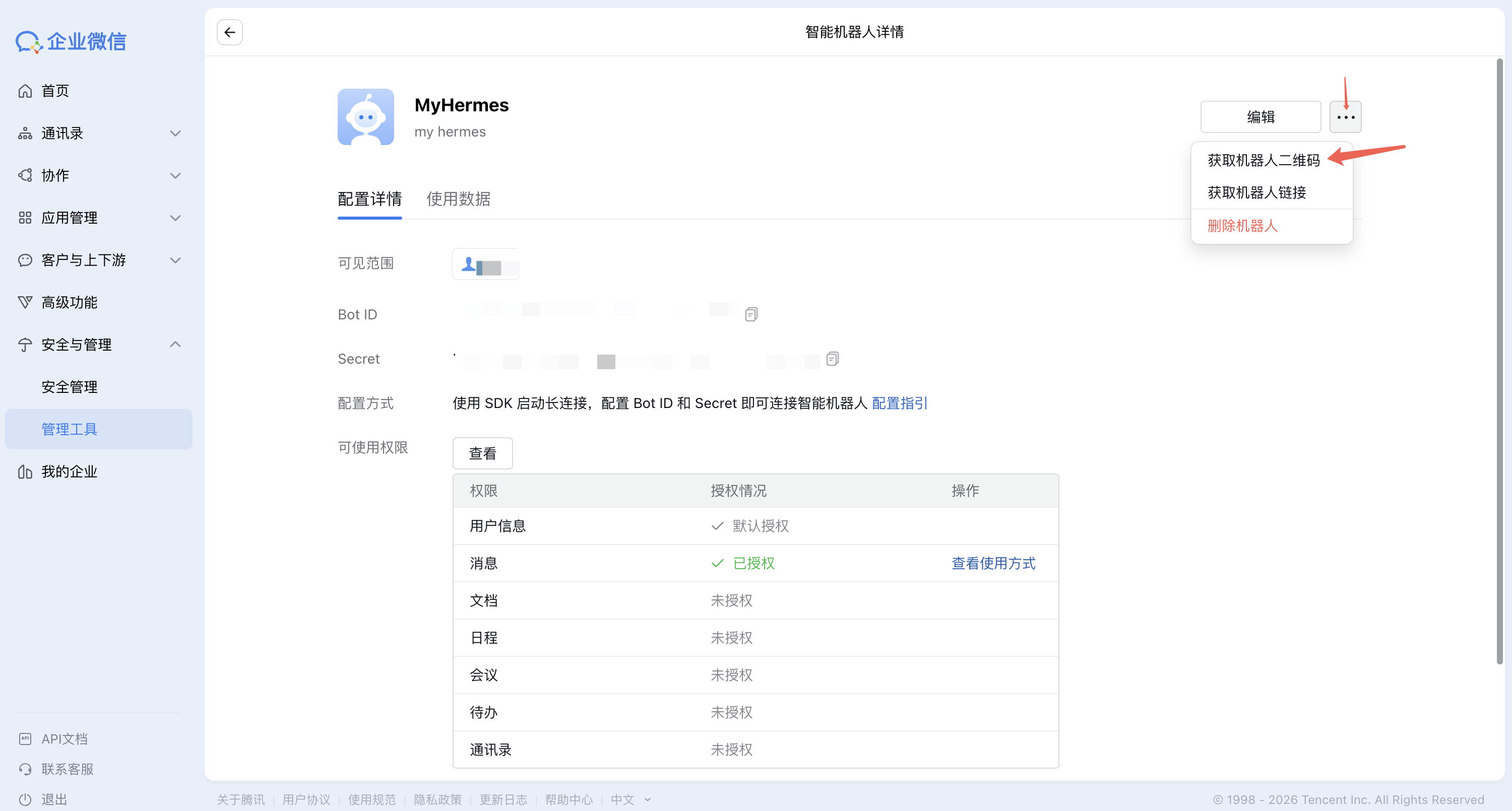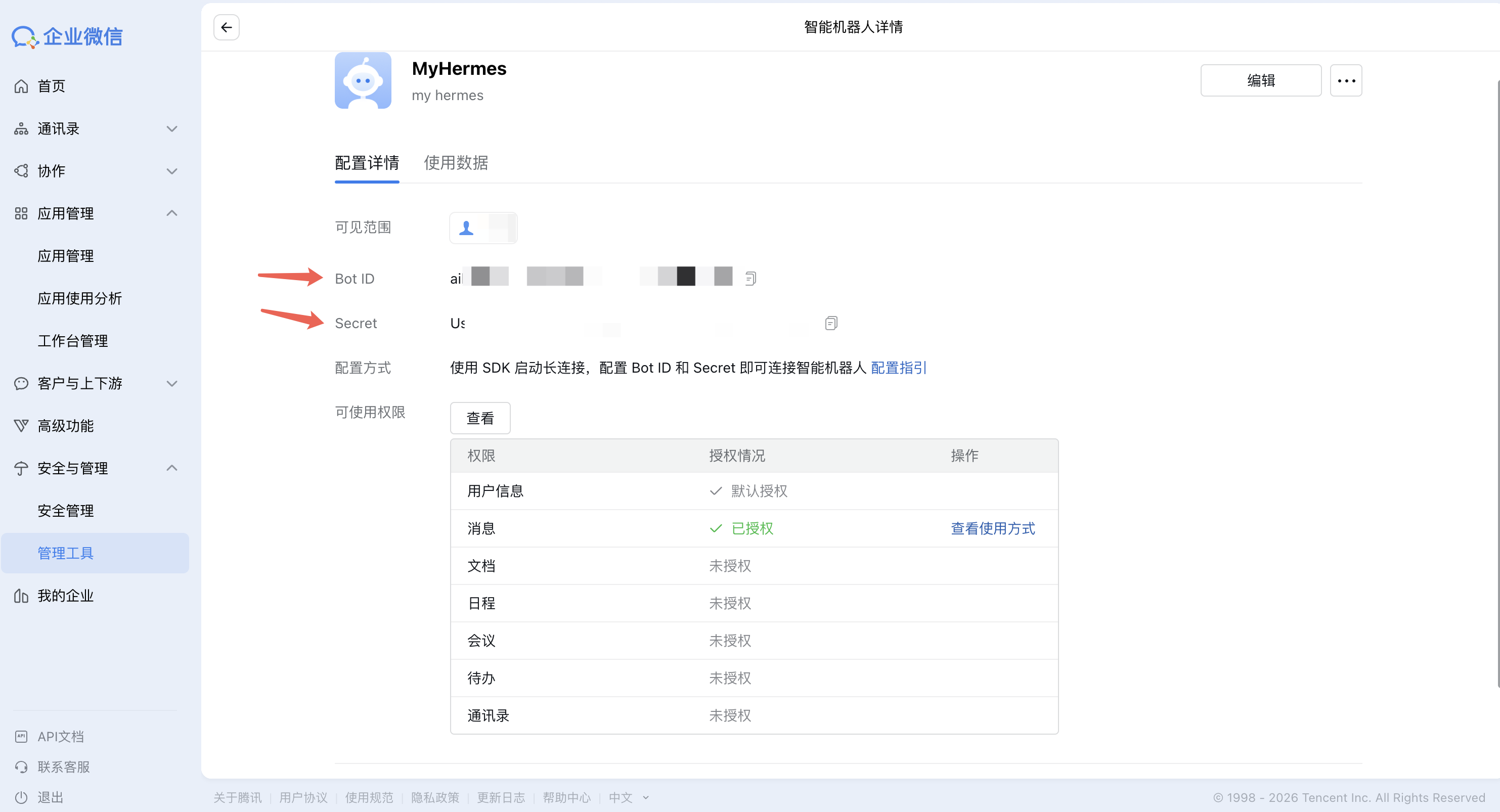 8. 获取 Bot ID (机器人的唯一标识)和 Secret (机器人的密钥,不要泄漏给他人),会在配置 Hermes Agent 时使用。