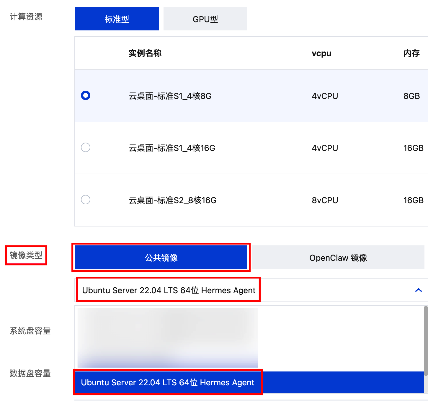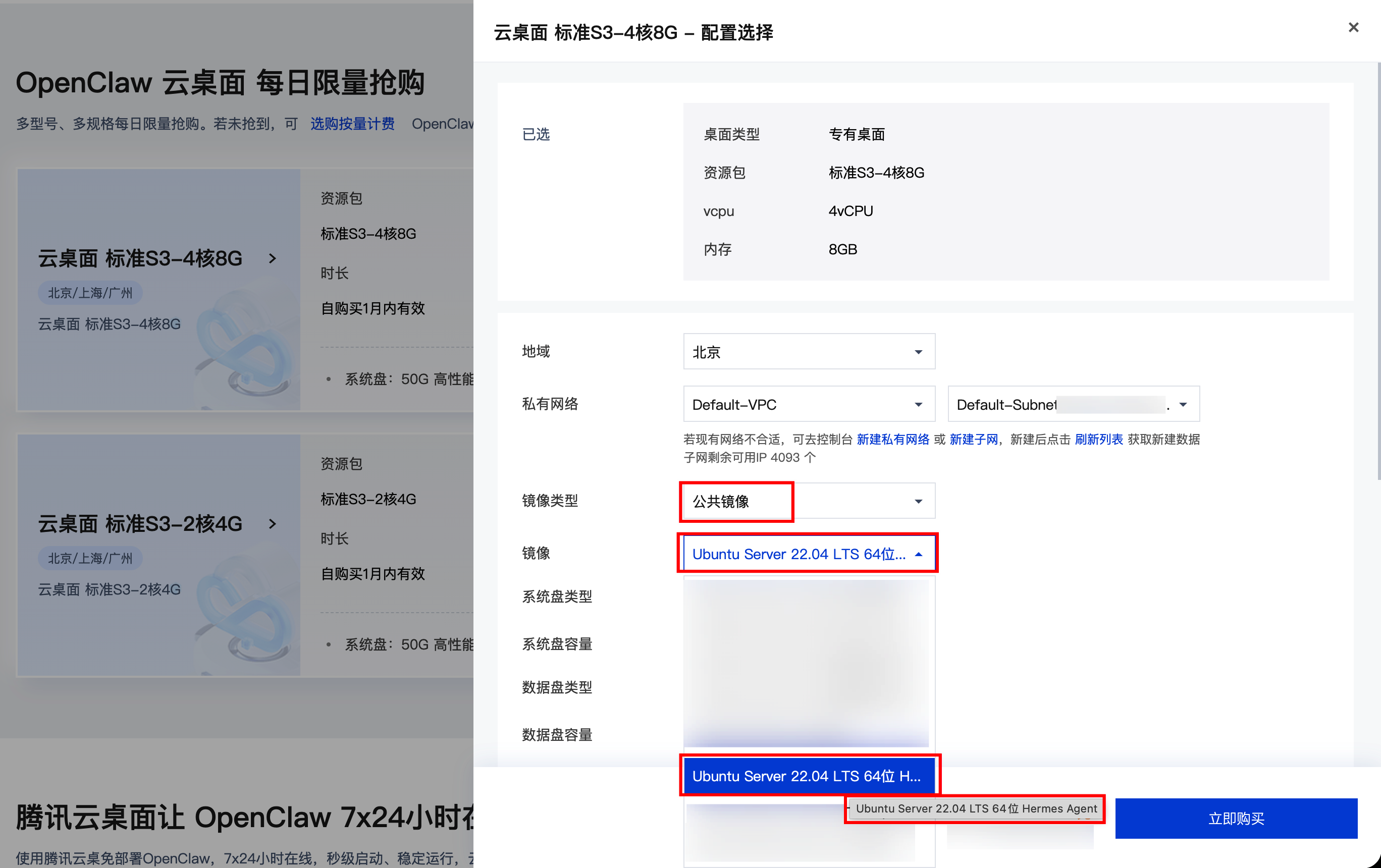1. 根据需要选择配置完成云桌面购买,镜像选择预装 Hermes Agent 的镜像,其余配置(实例基础配置推荐最低4核8G)可根据需要选择。