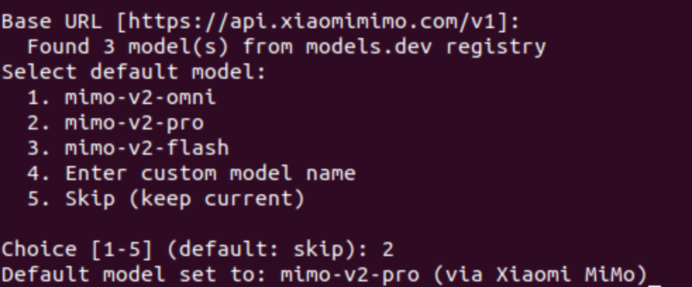 接下来终端会显示模型供应商支持的模型列表,使用上下方向键选择你想要使用的模型,然后按回车键确认。