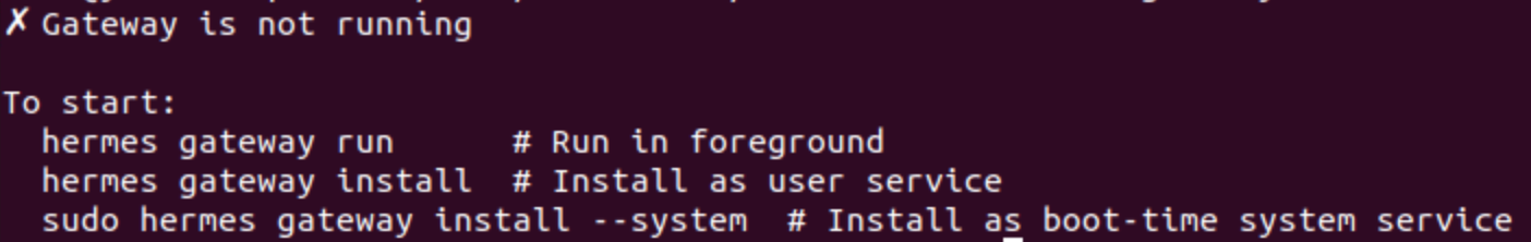 hermes gateway status 检查网关运行状态,此时网关没有运行。