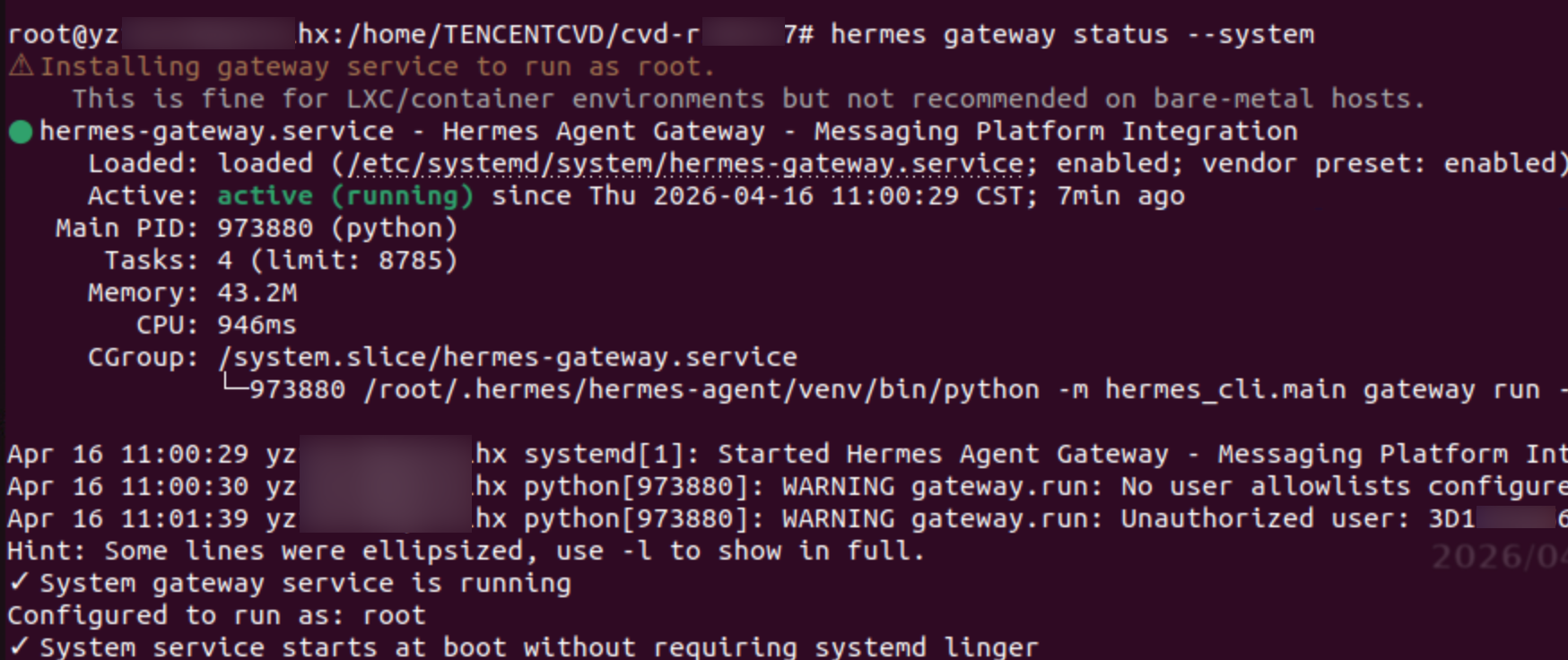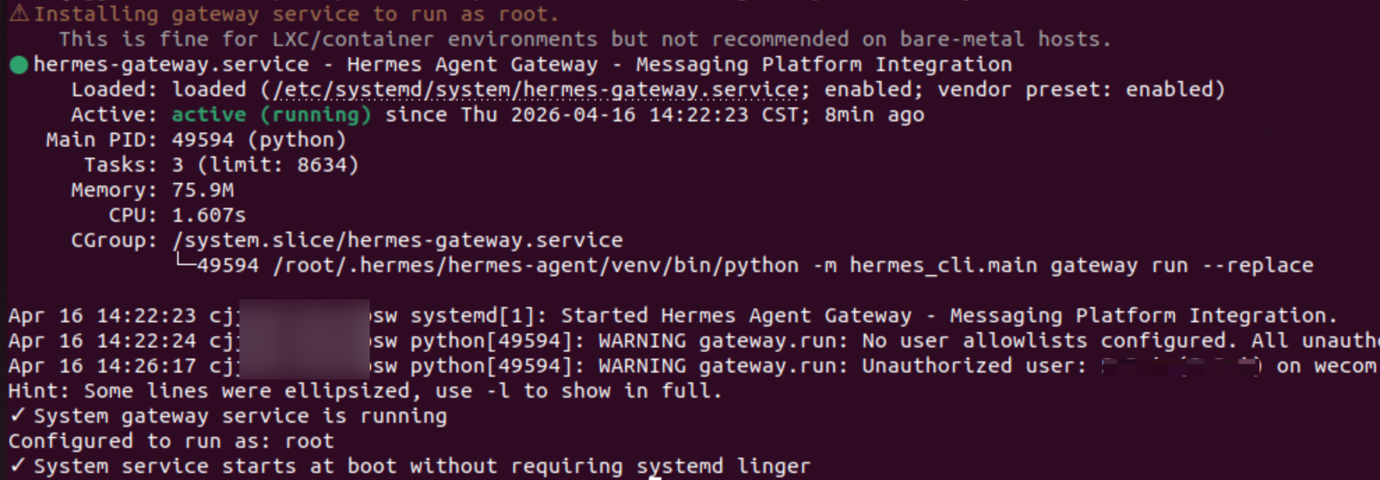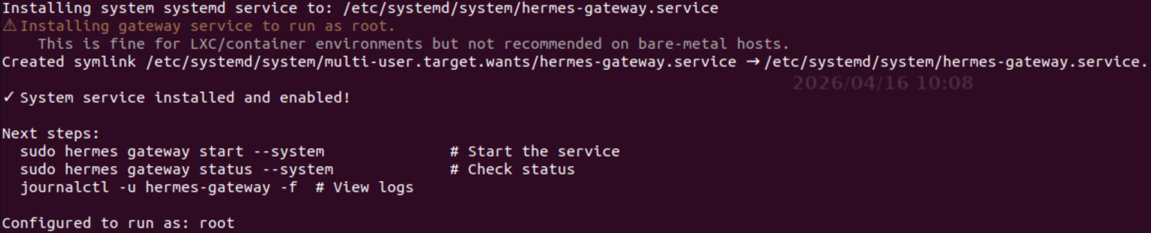 hermes gateway install --system --run-as-user root,将其作为系统服务安装。说明: