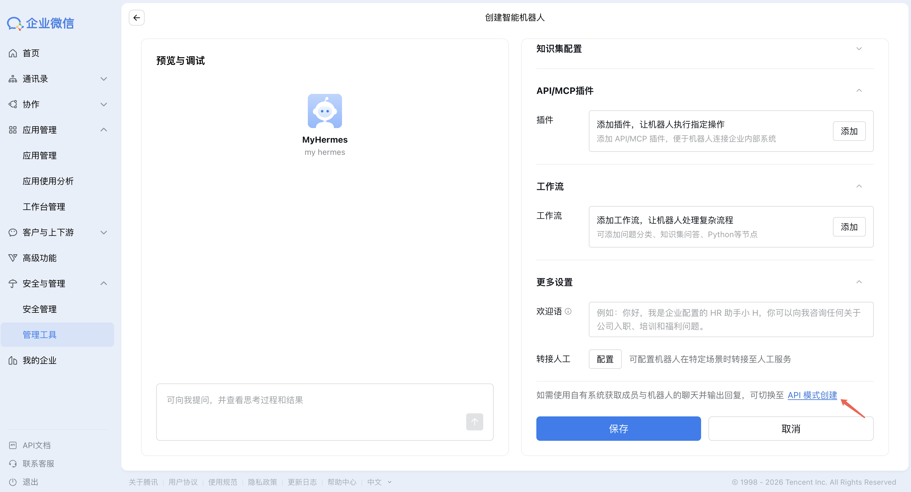 7. 配置可使用权限,选择消息,并保存,即可创建完成。
