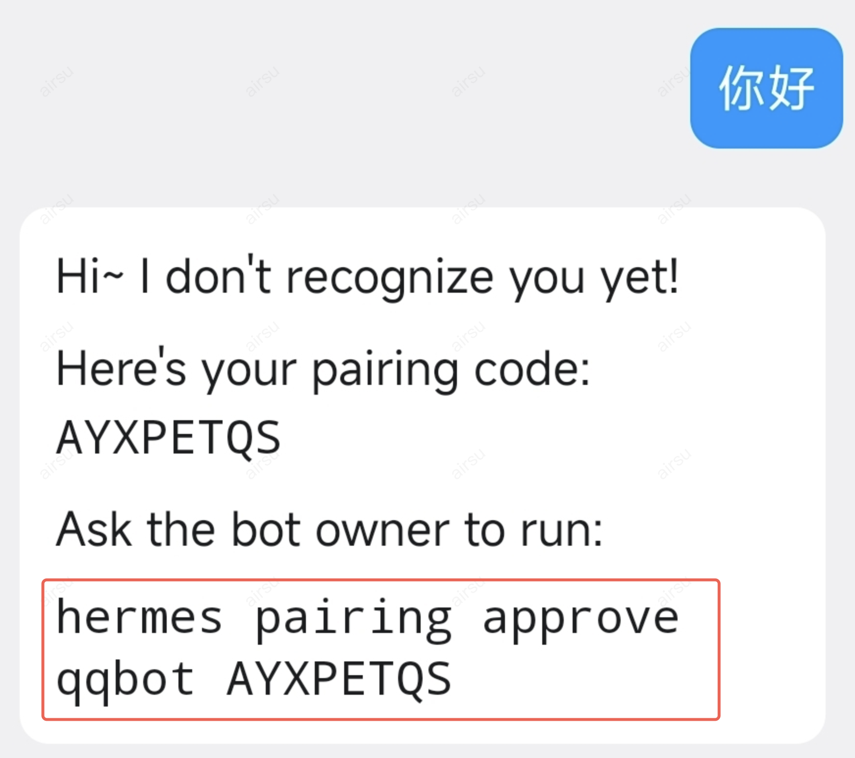 hermes pairing approve qqbot xxxxxx,回到终端粘贴并回车运行,看到如下信息,表示配对完成。