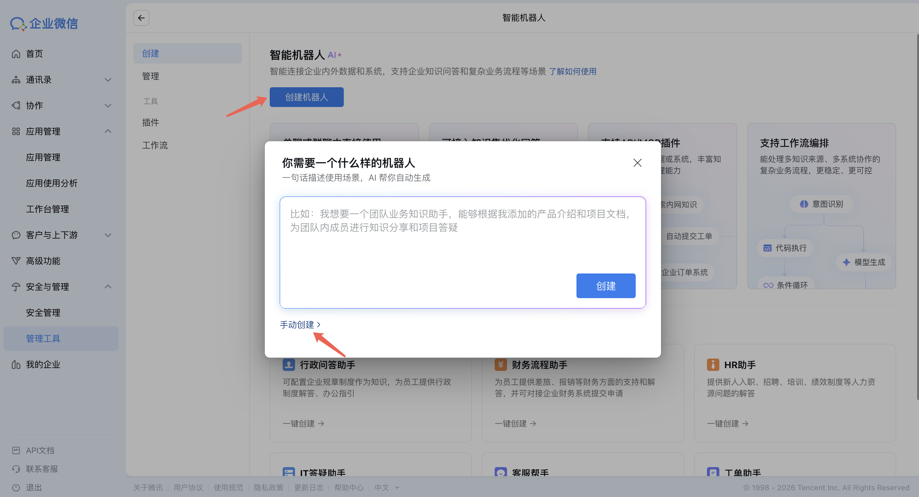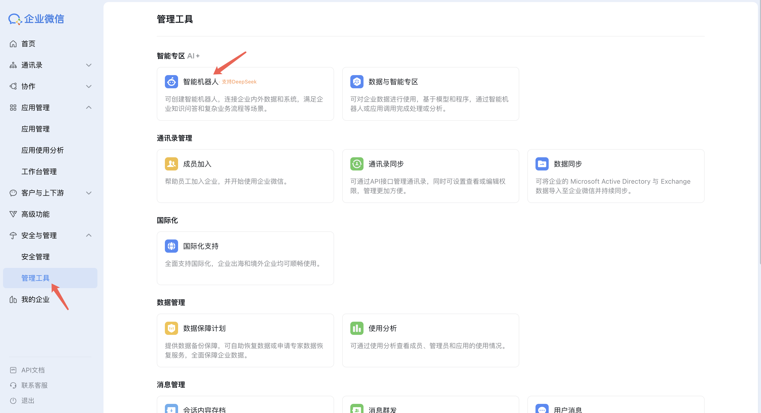 2. 在控制台左侧菜单栏找到安全与管理,单击管理工具,选择智能机器人。