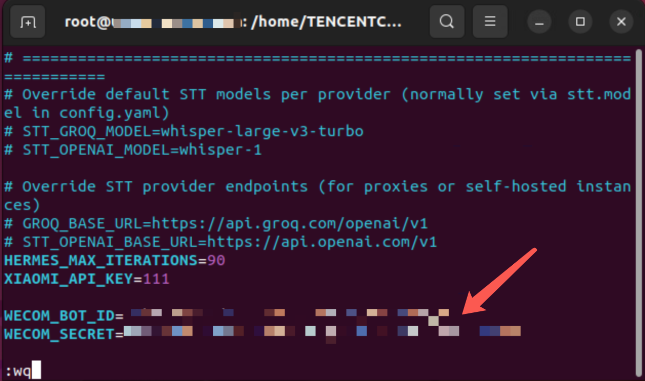 vim ~/.hermes/.env ,打开环境变量配置,添加 WECOM_BOT_ID 和 WECOM_SECRET。更多配置可参考 Hermes Agent 企业微信 Bot 配置文档。