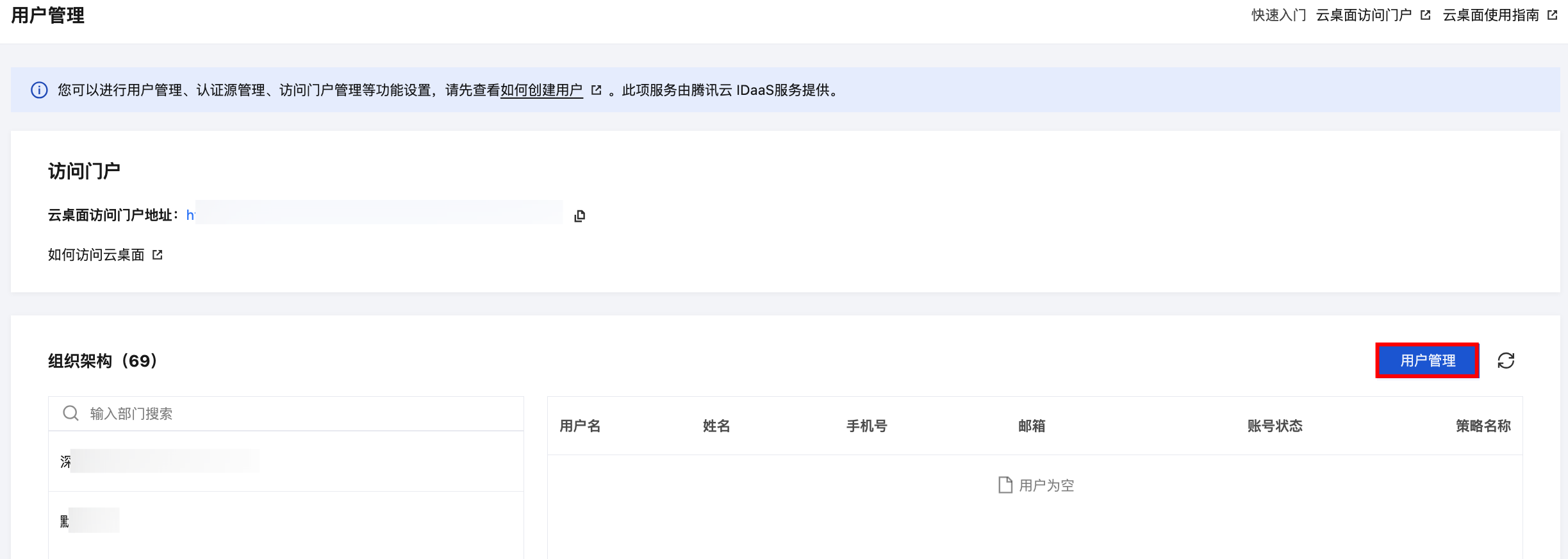2. 进入用户管理主界面,单击用户管理,跳转至腾讯云 IDaaS 界面。访问门户自定义设置由腾讯云 IDaaS 提供。
