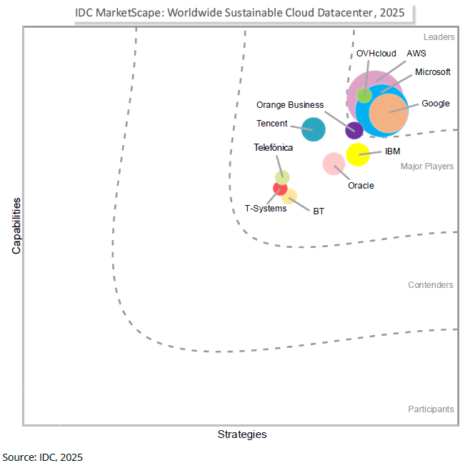 在2025 IDC MarketScape 全球可持续云数据中心评估中,腾讯云凭借其在全球基础设施布局、能效优化及可再生能源转型方面的稳健表现,位列 Major Players(主要参与者) 类别。