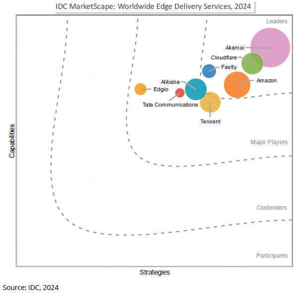 在 2024 IDC MarketScape 全球边缘交付服务评估中,腾讯云凭借其高度融合的边缘平台和全球化布局,被评为 Major Player(主要玩家)。