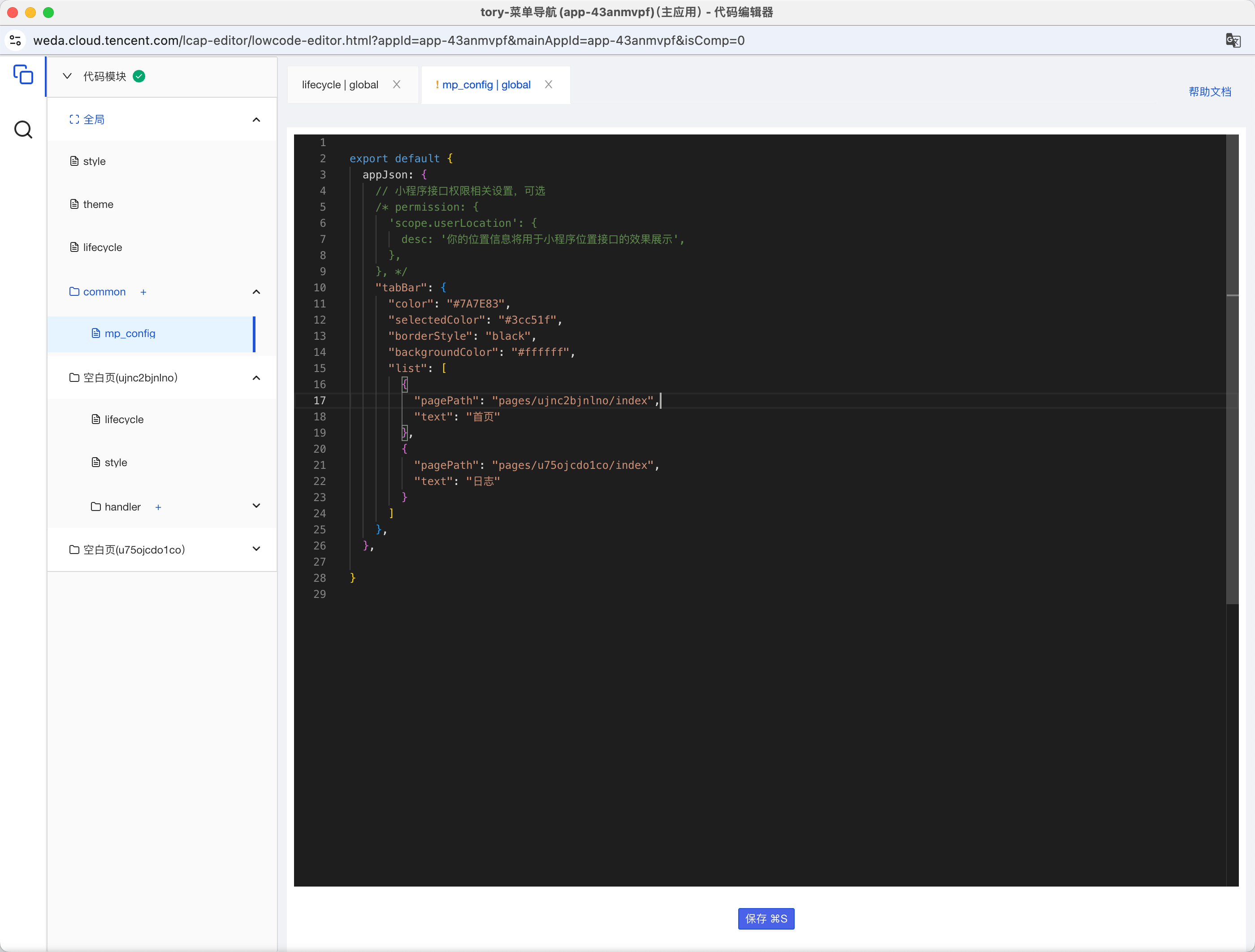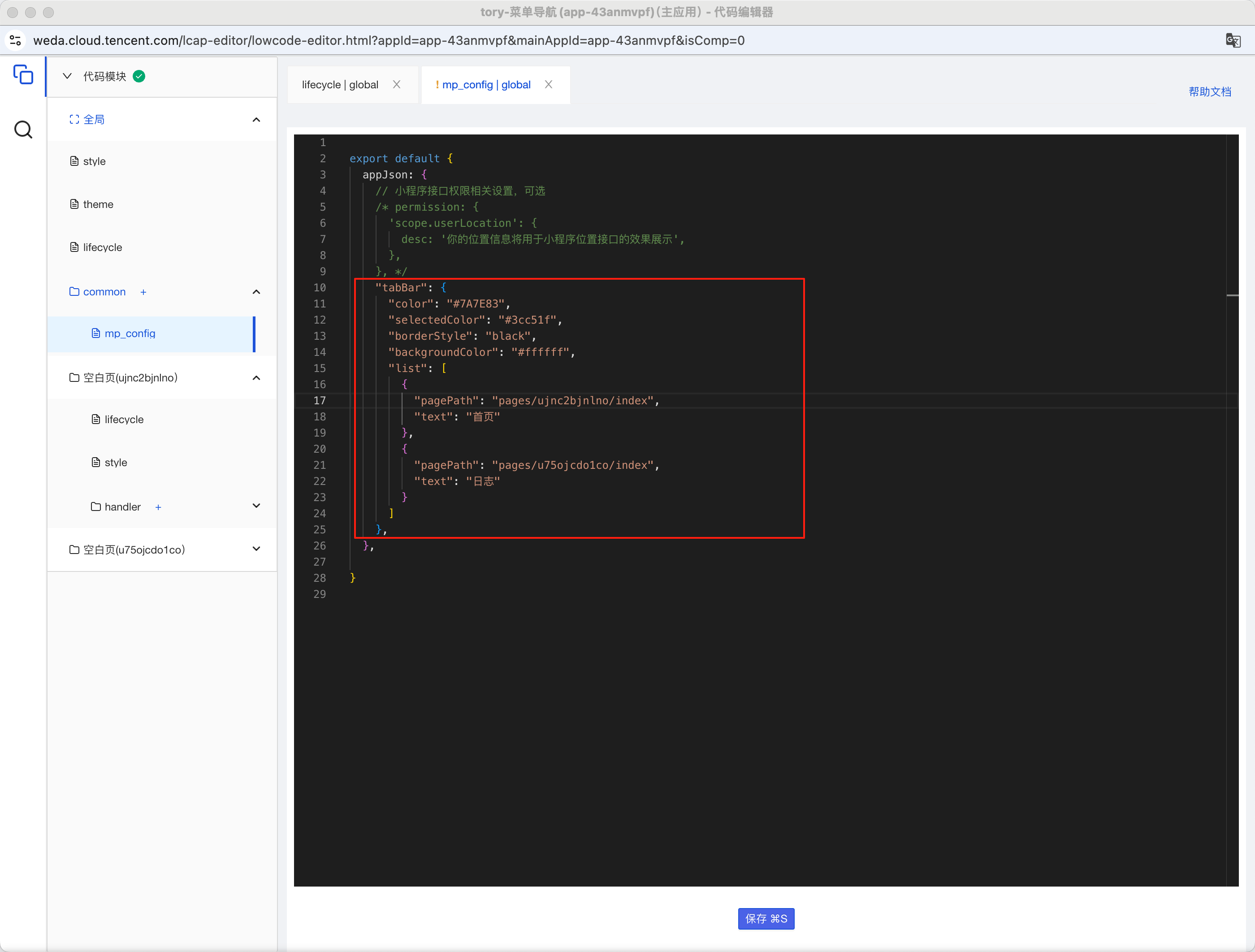 由于进入应用的通道不同,目前微搭提供了三种修改小程序全局配置文件的方式。本次实践将以小程序全局配置项 tabBar 属性进行案例展示。