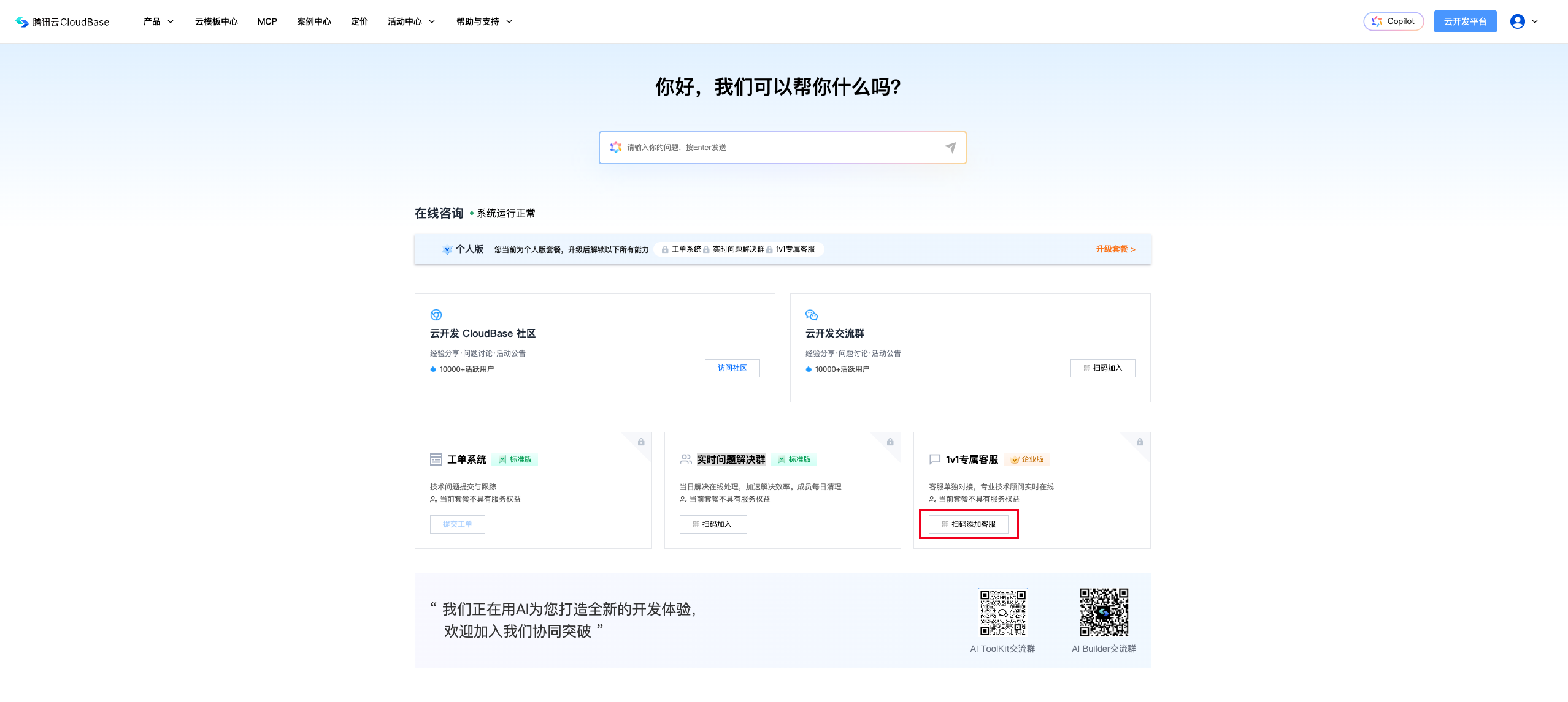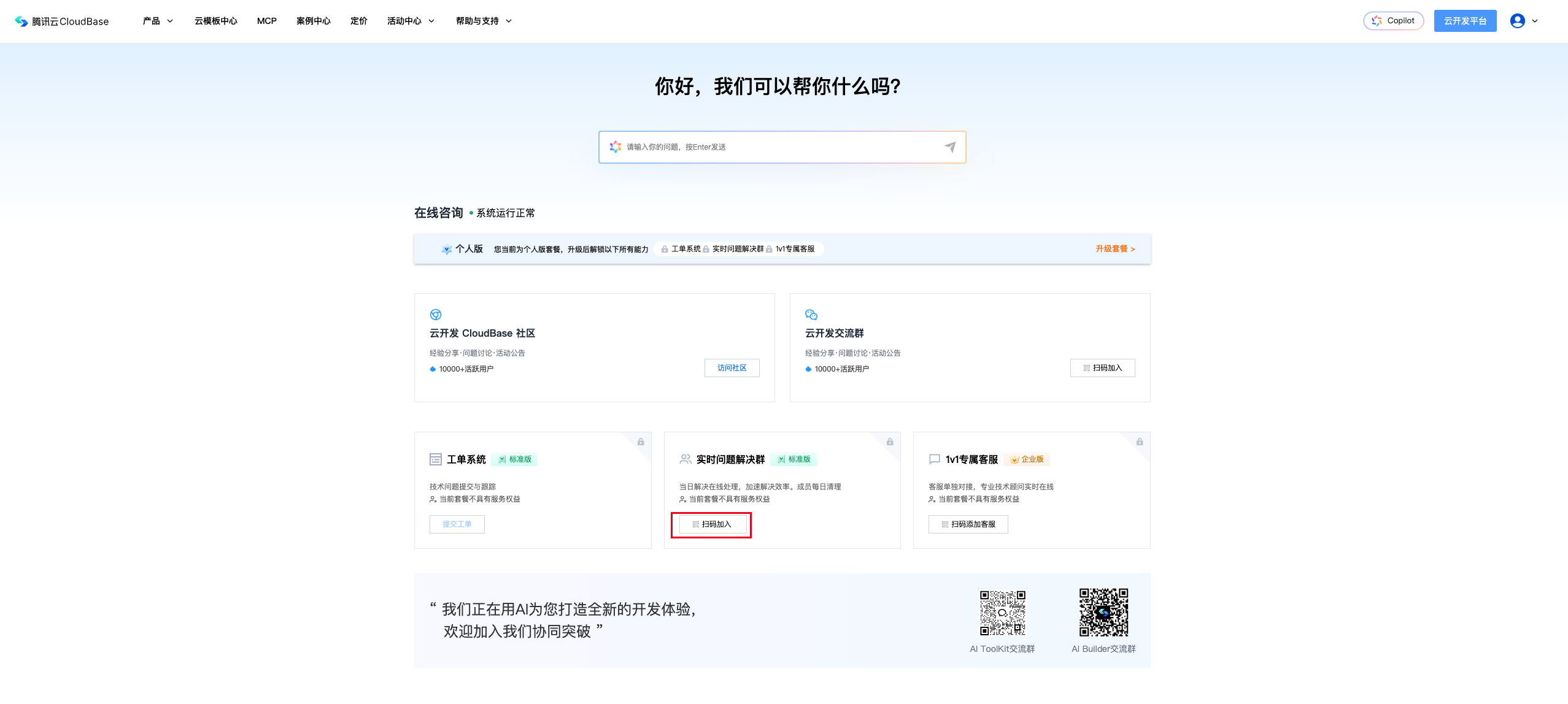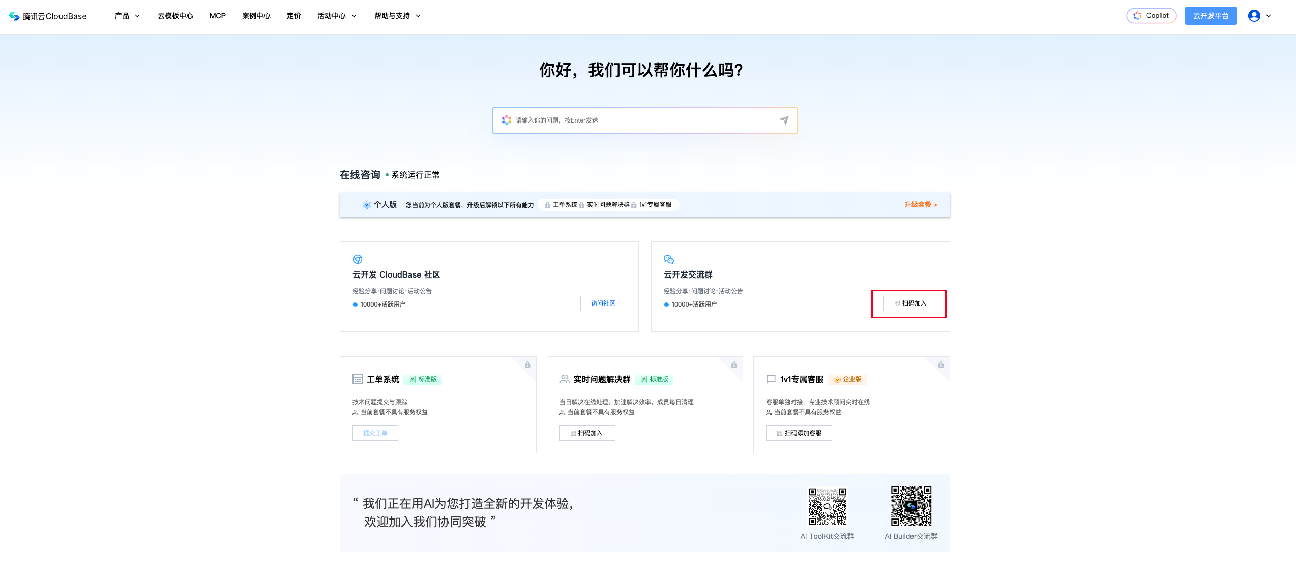 1.2 在帮助与支持页面,扫码加入云开发交流群。