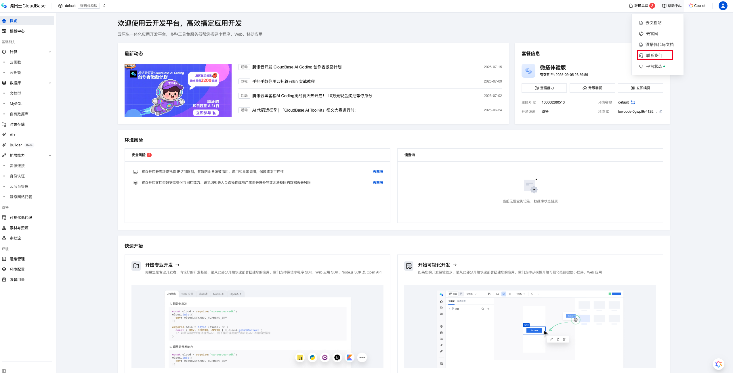 1.1 在云开发平台 > 帮助中心 > 联系我们。