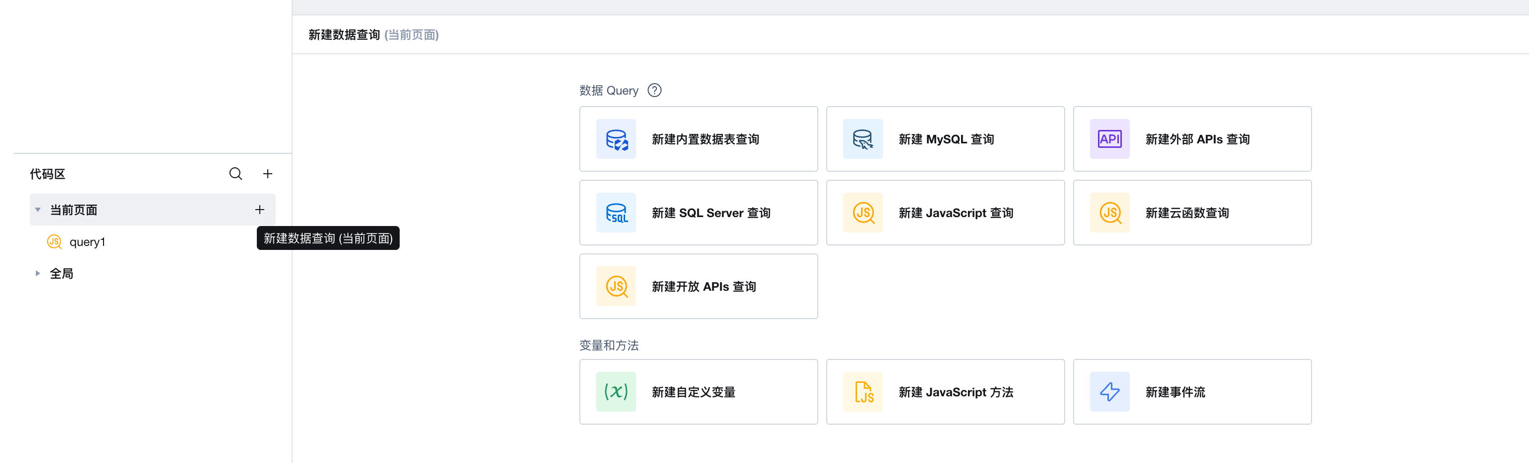 2. 在“代码区”,单击“+”,新建数据查询,选择“新建开放 APIs 查询”。